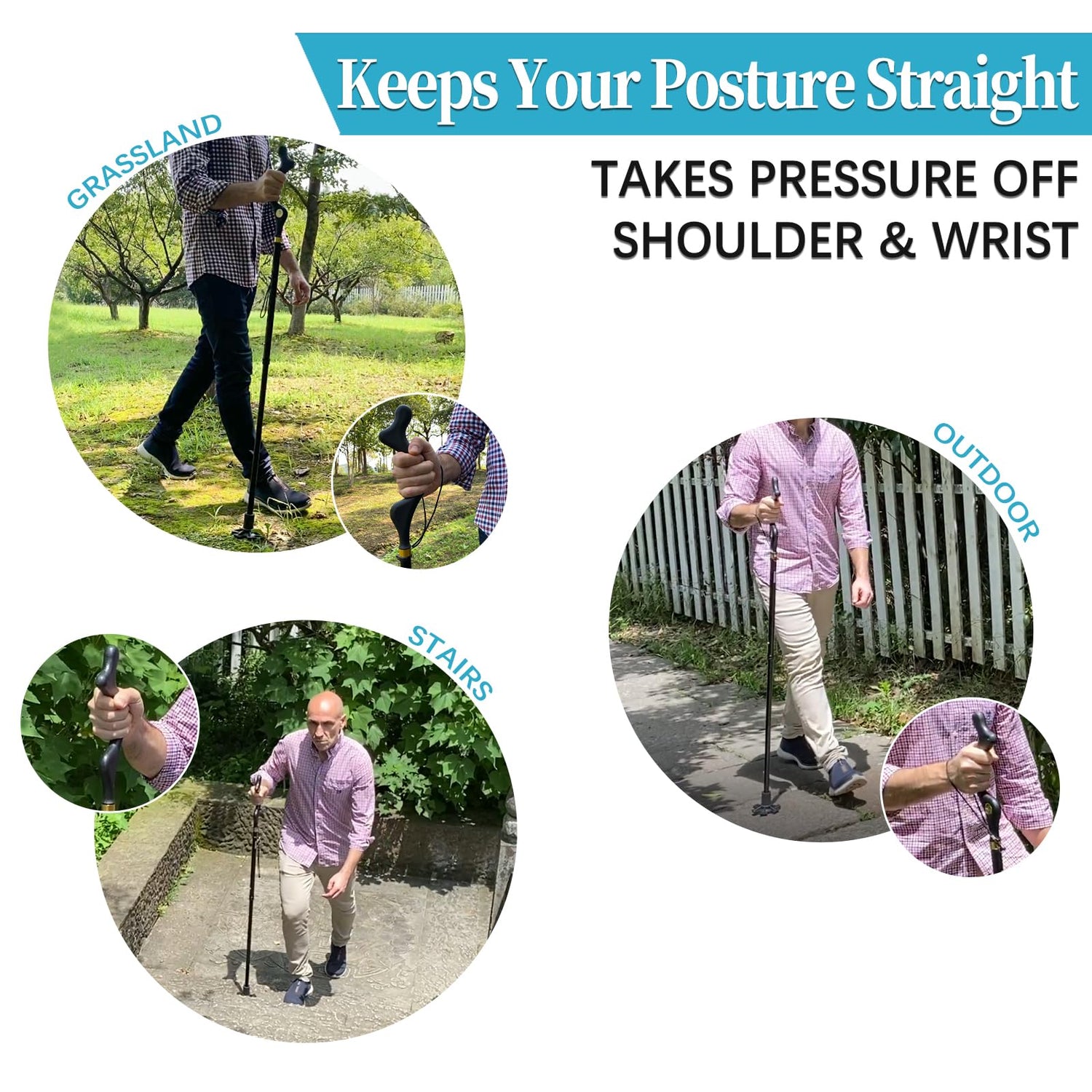 - Upright cane:Comfortable balanced walking cane helps you walk upright, the handle design makes you walk straight and which is good for your back , shoulder and wrist.