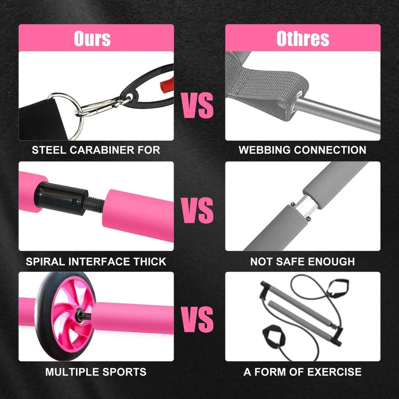 - ▶【Upgrade Pilates Bar Kit】We've upgraded the pilates bar resistance band, with two length options for a more efficient and precise workout.Work your upper and lower body, target core muscle strength training. In particular, pilates equipment with the AB roller system, you can easily upgrade your abs with the cushioning protection of resistance bands, creating a perfect muscular line with multi functional pilates bar. This can only be done with our unique three-bar structure.