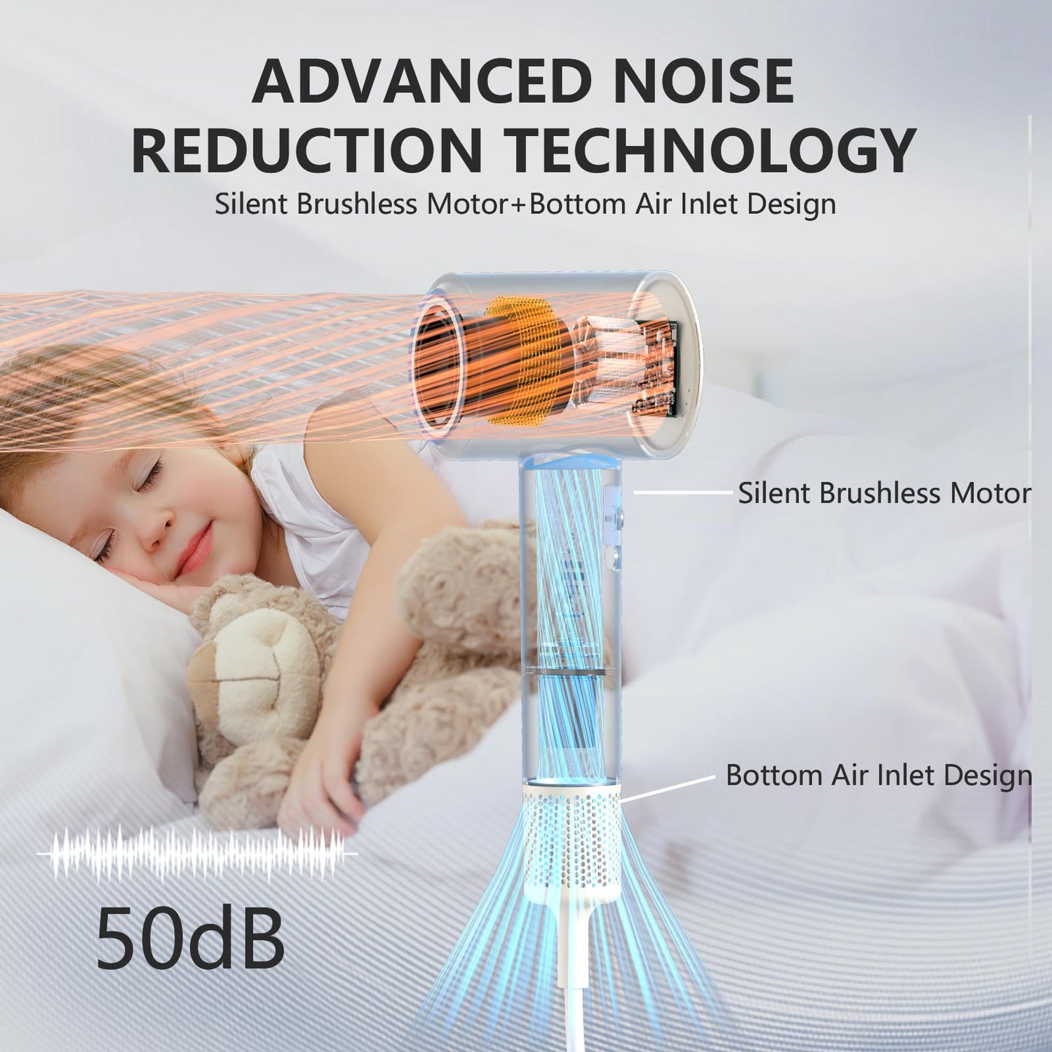 - 【Quiet and Fast Drying】This professional hair dryer uses a 160000 RPM high-speed brushless motor that offer a powerful airflow of 35m/s wind speed, achieves the transformation of natural wind drying instead of heat drying hair, making your hair healthier. 5X times faster than traditional hair dryers, it takes only 1-5 minutes to dry hair while operating at low noise below 50dB for quiet drying.
