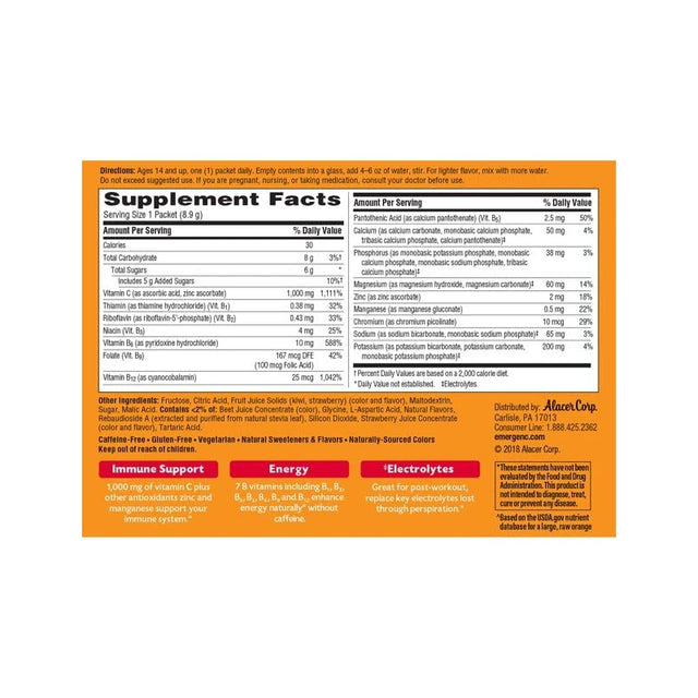 - Includes 30 individual serving-size packets (0.31 oz. each) of Emergen-C Strawberry-Kiwi flavor fizzy drink mix