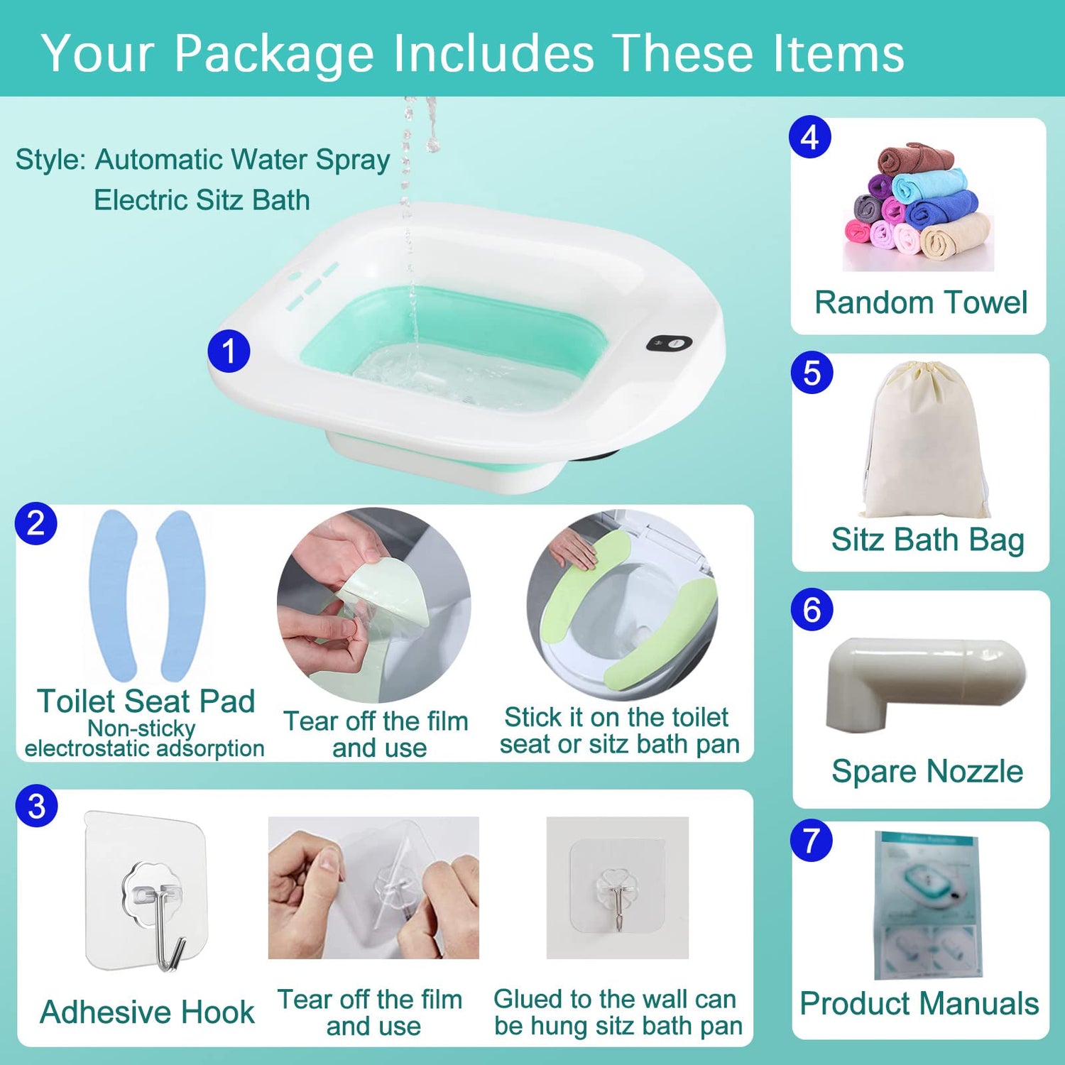 - ✅Unisex Style - The nozzle of this squat-free sitzbath can rotate 360 degrees. You can move it under the anus or perineum. It is a great gift for male, female, seniors, adults or teens. In addition to the electric sitz bath pan, there are toilet seat pad, storage bag, wall hook, towel, spare nozzle and Product Manuals.