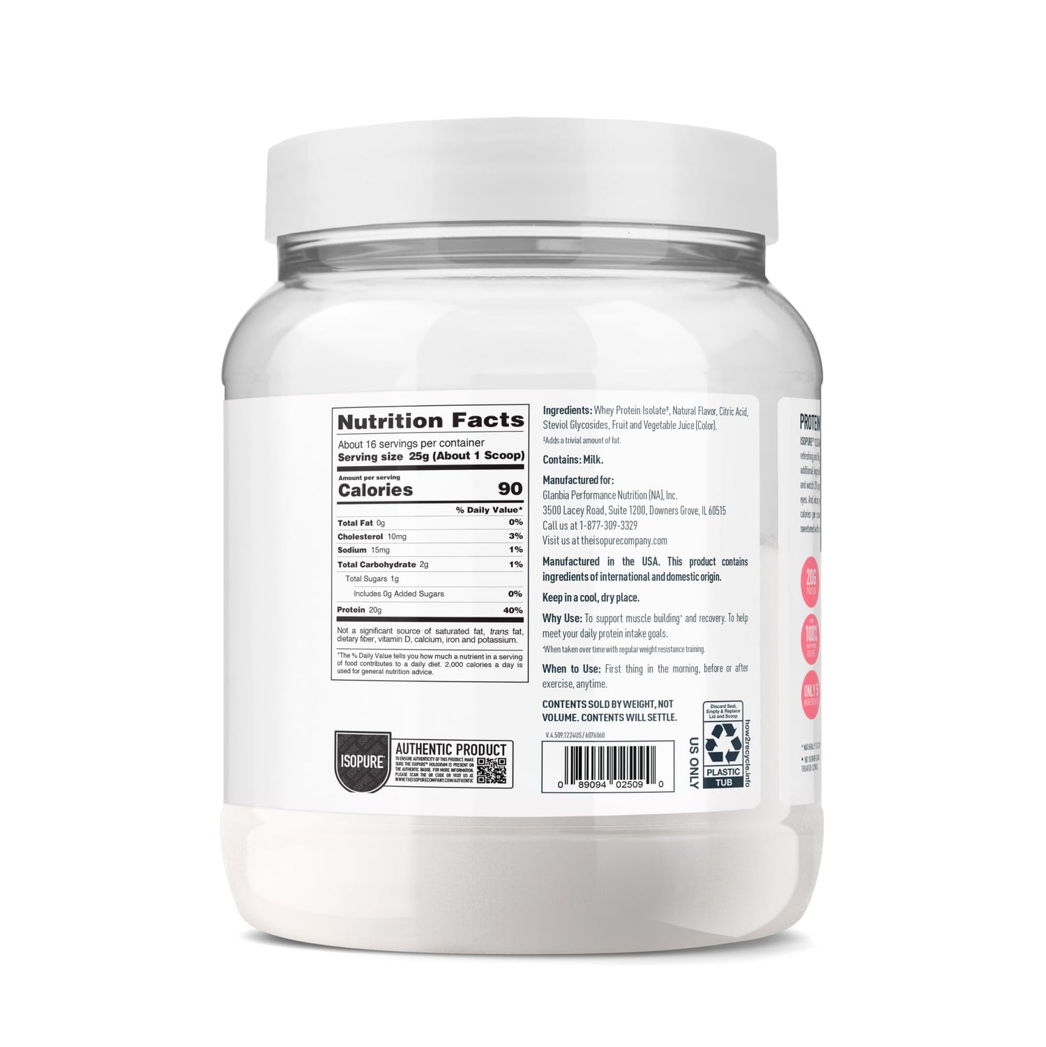 Details: Add less and do more with Isopure 100% Pure Whey Isolate Protein Powder Infusions — a naturally flavored Isopure protein powder designed to be gluten free and lactose free. The protein powder is ultra hydrolyzed to easily mix into a colorful, translucent beverage that drinks like protein water. Experience a thirst-quenching fruity burst of tropical punch flavor with each sip of your new favorite drink mix. Formulated with five simple ingredients and zero added sugar, this great-tasting protein shake helps meet your daily protein intake goals and aids overall wellness. Just mix one 25-gram scoop of this 100% clear whey isolate with 10-16 fl oz of cold water, and wait about a minute after shaking for the natural foaming to settle. Use it first thing in the morning, before or after exercise, or anytime you want a protein supplement boost. This clear whey protein isolate helps support muscle health and is a great choice for post workout recovery. It works best in combination with high protein foods and protein supplements as part of a balanced diet and exercise program. Add Less. Do More.