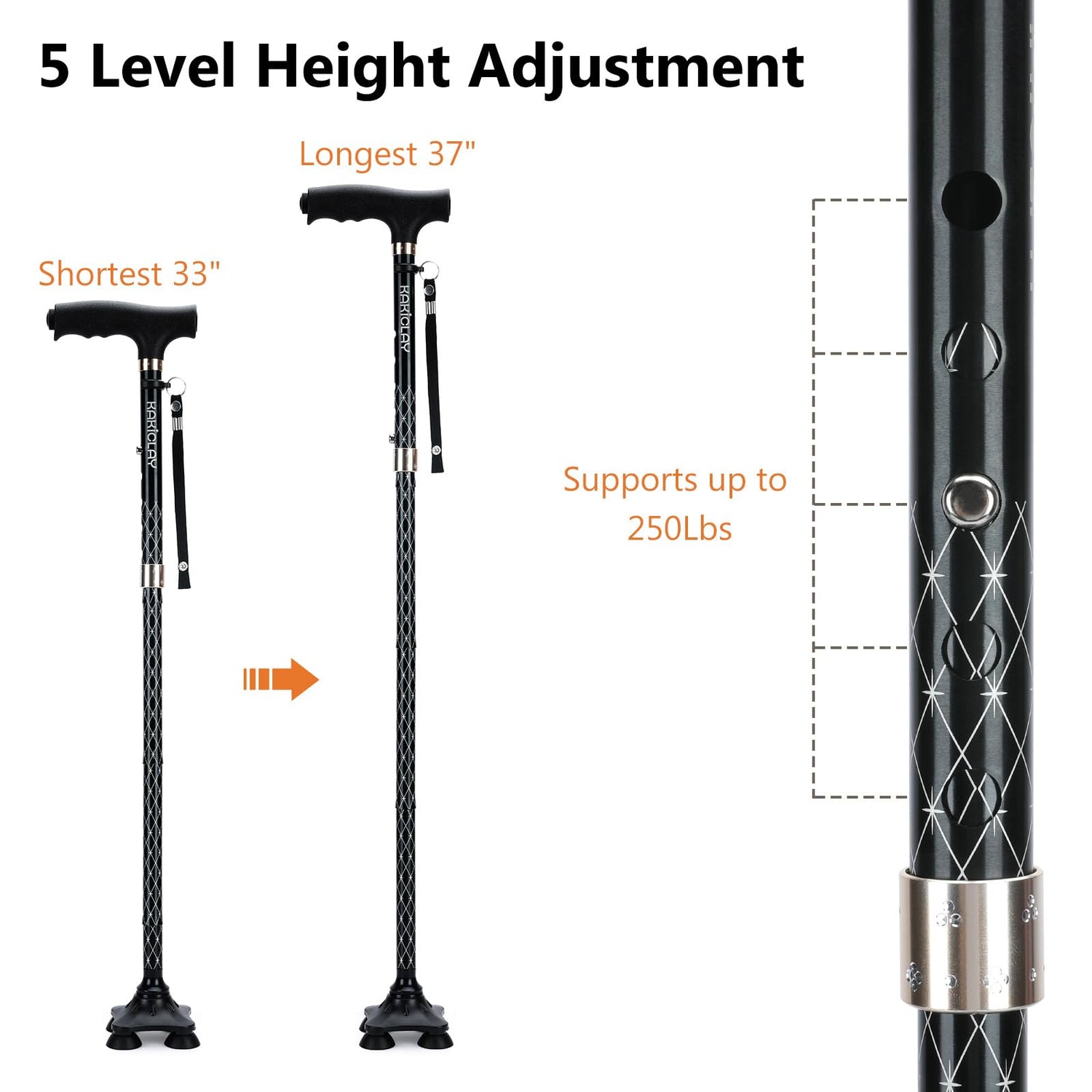 - 5 ADJUSTABLE HEIGHT LEVELS - With a simple push of the button the cane allows you to adjust the height from 33" to 37". Fits most individuals from 5' to 6'5" tall.