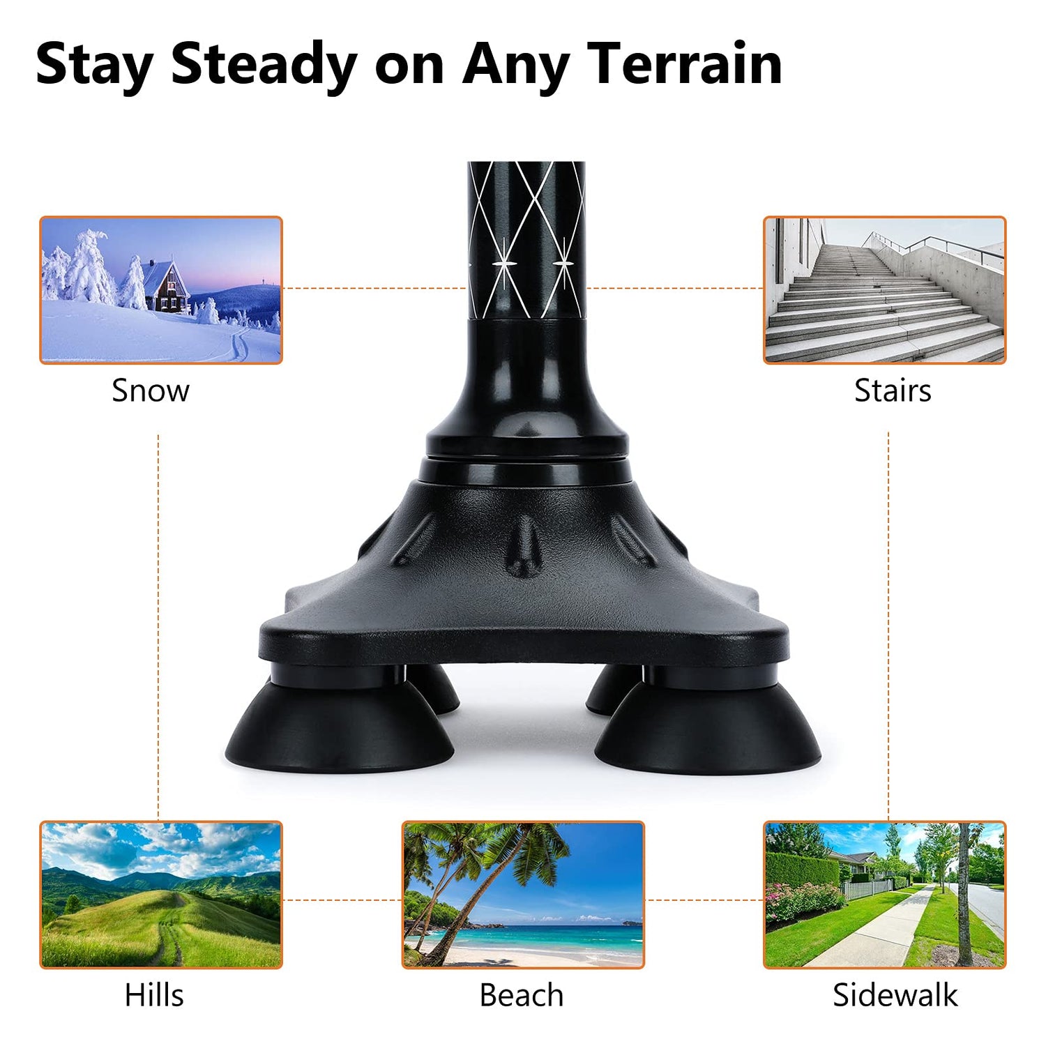 - 4-POINT ANTI-SLIP RUBBER BASE - Features a 4 prong cane base with an anti-slip backing that helps keeps maintain balance when walking up and down stairs, on grass, sand and even snow.