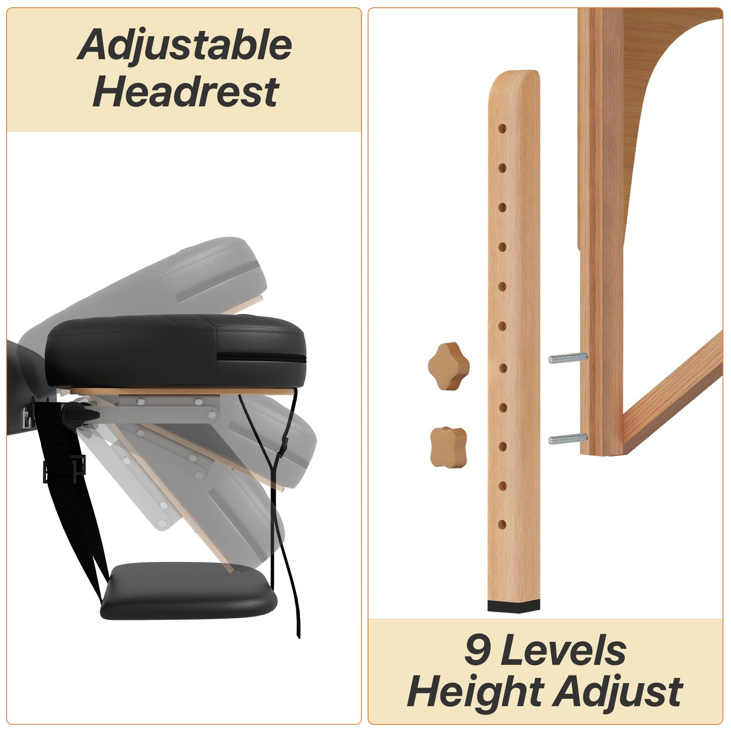 - 【Adjustable Height】: The height of the massage table can be adjusted by twisting adjustment knobs on each leg. It can be adjusted by turning off the knobs on the leg and take out the movable leg to adjust the height by choosing the holes on the movable leg. And then, put back onto the leg and fasten the knobs firmly. So when you start using the massage table, pls make sure the knobs was locked firmly.