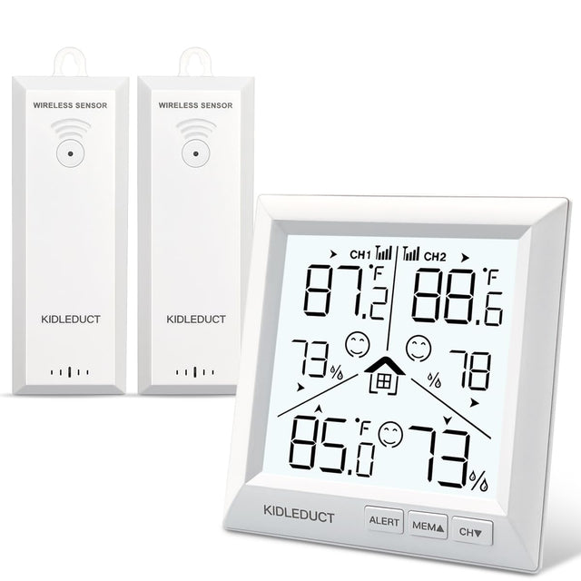 KIDLEDUCT Indoor Outdoor Thermometer Wireless Battery Powered, High Precision Inside Outside Humidity Temperature with Alert, Backlight Weather Thermometers with 2 Sensors, 330ft Wireless, White