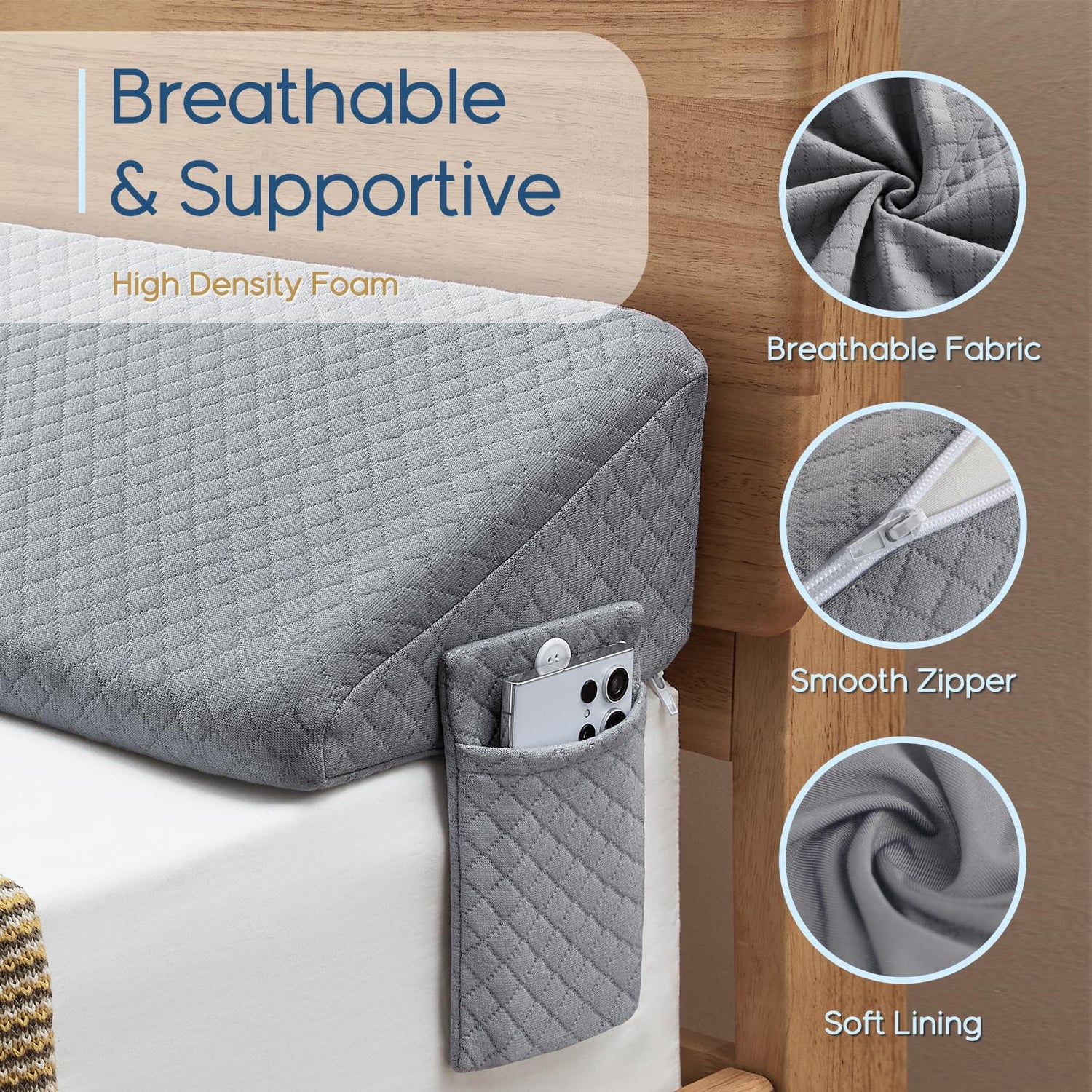 - 【Side Pocket Design】Our triangle bed wedge cushion pillowcase is made of high-quality breathable material, certified by Oktex and Certipur-US, and will not sweat with long-term use. Both sides of the headboard wedge pillowcase are designed with reinforced pockets, which can facilitate you to place your cell phone, remote control, glasses or other items at any time.
