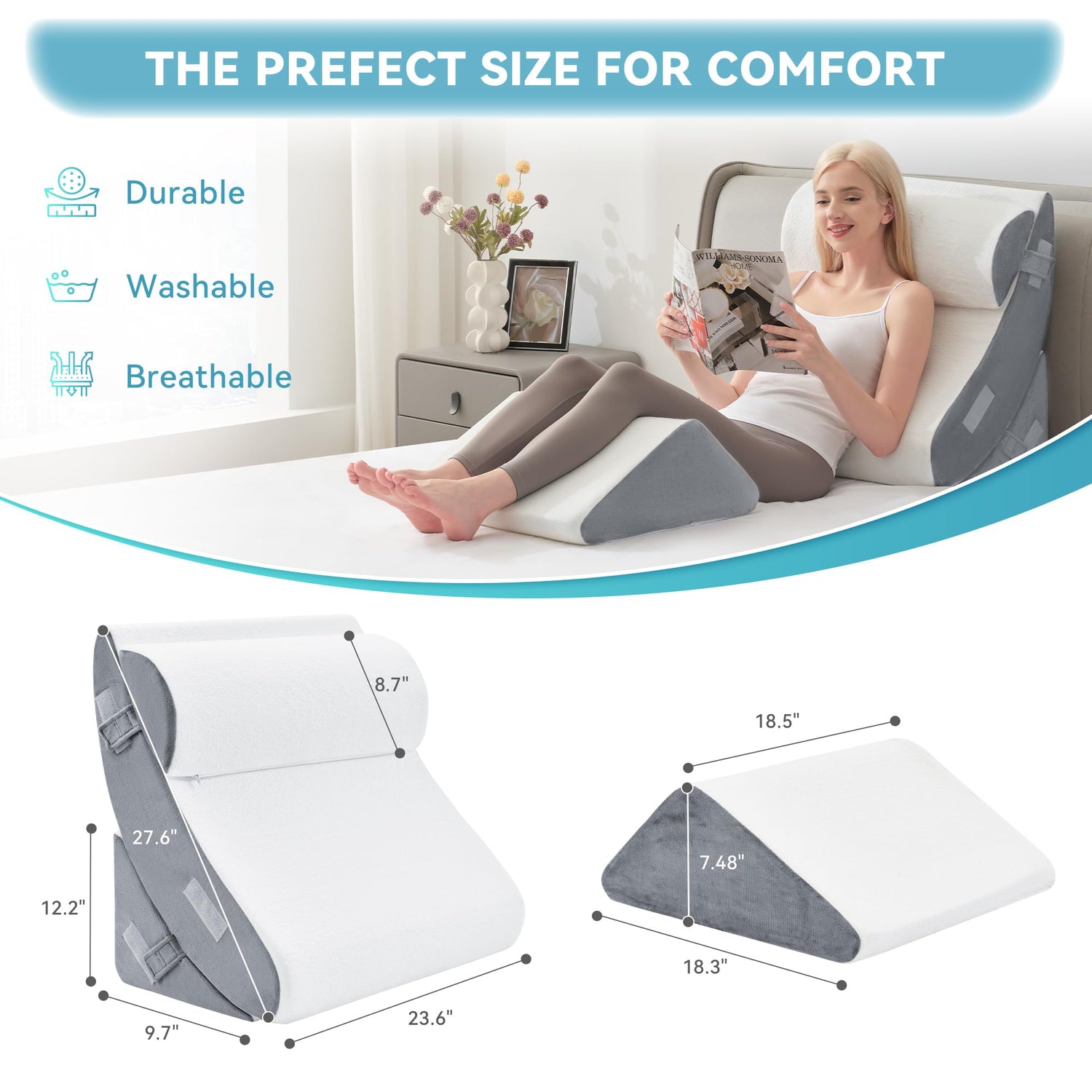 - MULTIFUNCTIONAL WEDGE PILLOW: KINGFUN surgery pillow consists of four parts that can be combined. Choose a proper angle for sitting up, lying down and sleeping on the adjustable back pillows. Leg elevation pillow can relieve discomfort and pressure on the legs and knees. The elongated foam wedge pillow can be used to support the head or as an arm pillow.