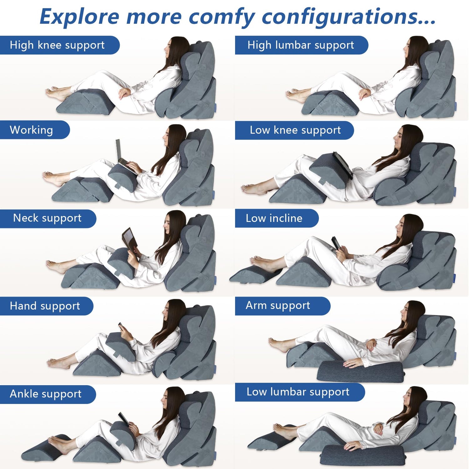 - 【Soft & Supportive Gel Memory Foam】The back pillow, lumbar pillow and the head pillow of the wedge pillow set are made of soft memory foam with gel particles, which ensures comfortable and refreshed even with prolonged use. The base pillow, leg pillow and knee pillow are made of high-density foam, which provides sufficient support and will not deform after long-term use.