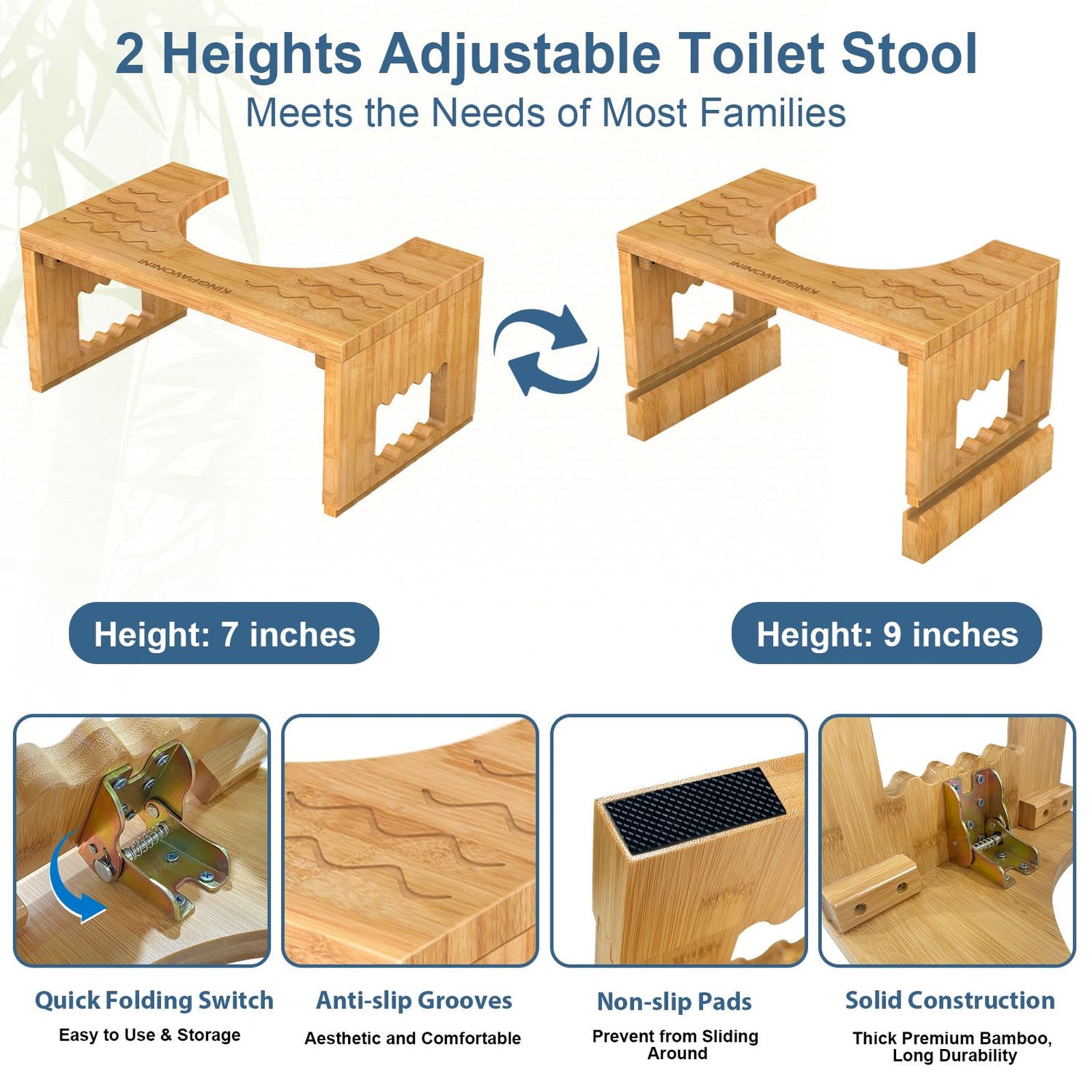 KingPavonini Bamboo Toilet Stool Squat 7in & 9in Heights Adjustable, Foldable Poop Stool for Adult, Potty Stool for Bathroom with Non-Slip Grooves Portable, Space-Saving, 400 lbs Capacity