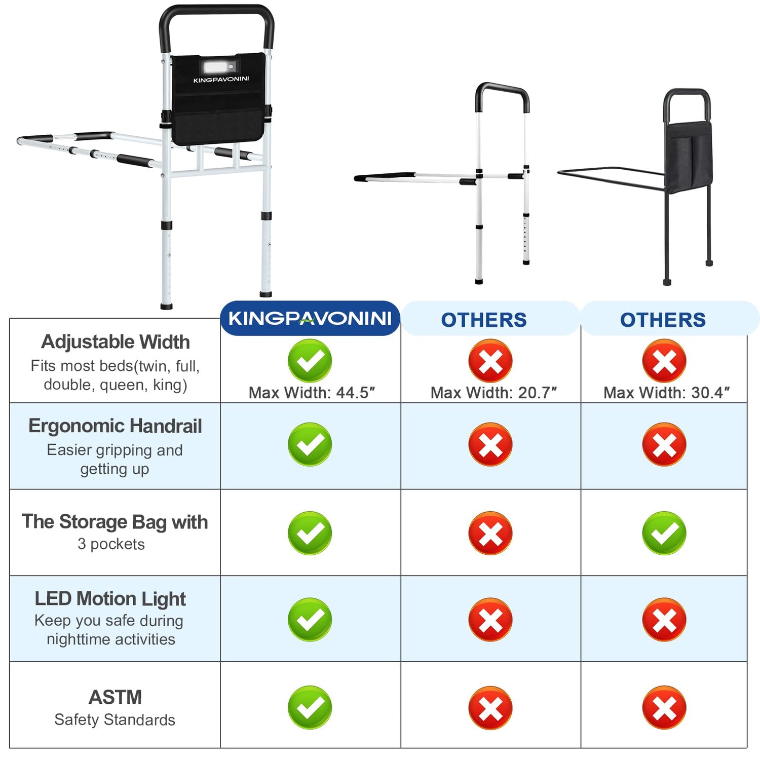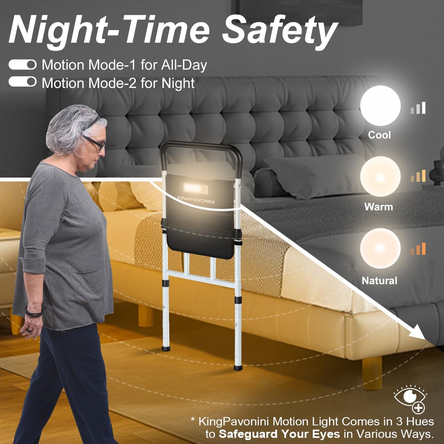 KingPavonini Bed Rails for Elderly Adults Safety, with Motion Light & Storage Pouch, FSA/HSA Eligible 400LBS Robust Bed Assist Rail with Support Legs for Seniors & Surgical Patients,Tool-Free Assembly