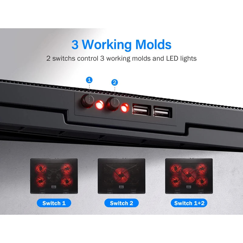 - 5 Built-in fans (big fan: 5.9-inch, small fans: 2.76-inch) with Red LEDs, two On/Off switches to control 5 fans and LEDs simultaneously. (Simply press the switch to select 1 fan working, 4 fans working, or all 5 working together.)