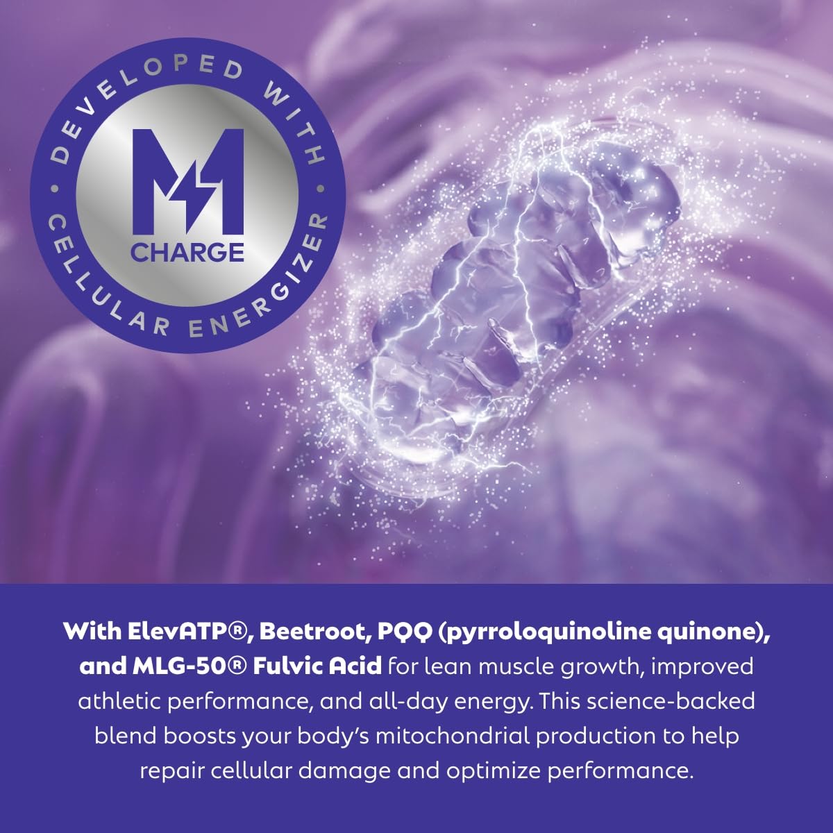- M-CHARGE COMPLEX: With ElevATP, Beetroot, PQQ (pyrroloquinoline quinone), and MLG-50 Fulvic Acid for lean muscle growth, improved athletic performance, and all-day energy. This science-backed blend boosts your body’s mitochondrial production to help repair cellular damage and optimize performance.