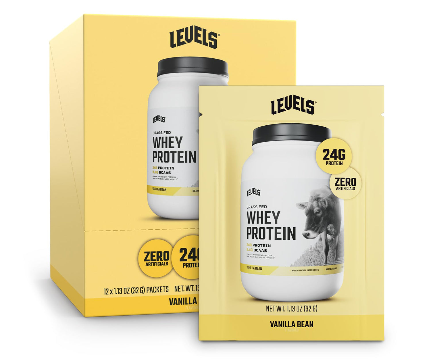 Levels Grass Fed Whey Protein Powder, No Artificials, 24G of Protein, Vanilla Bean, 12 Count