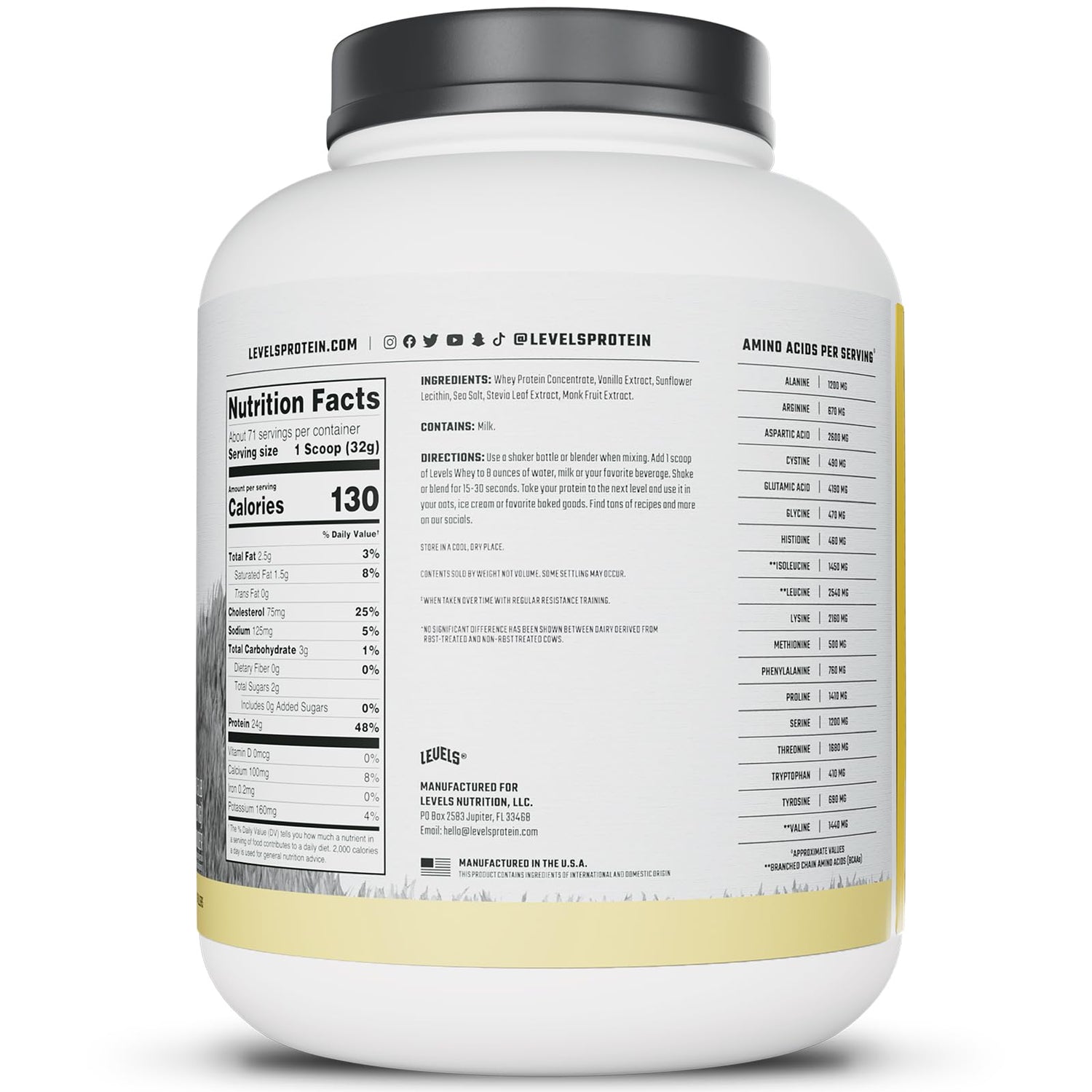 - MADE IN THE USA: Levels Whey Protein is made in the U.S.A. and is undenatured to protect bioactivity and naturally occurring growth factors. Each batch is cold-process microfiltered and blended with non-gmo sunflower lecithin for that insanely easy mixing you expect.