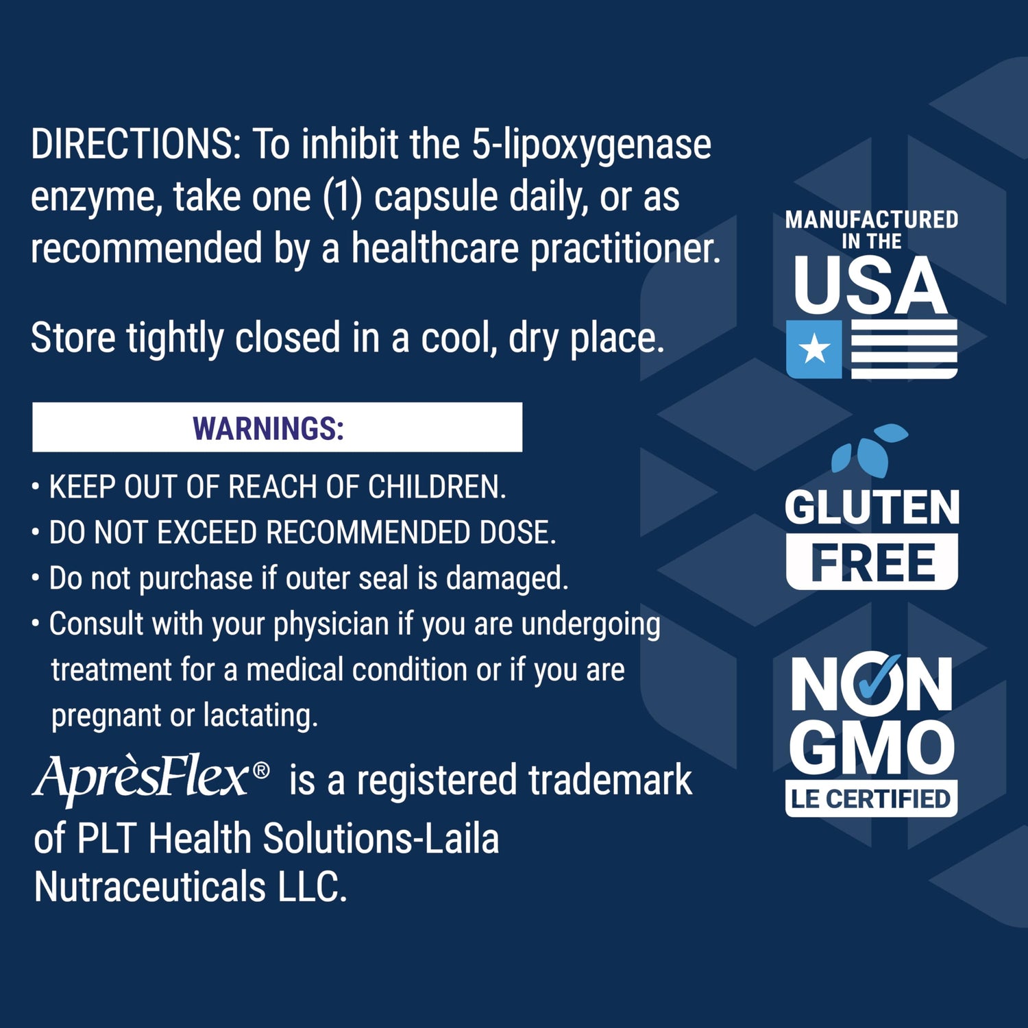 Details: 5-LOX Inhibitor with AprèsFlex® is an innovative formula for joint, cell and arterial health. It contains a standardized form of Boswellia serrata called AprèsFlex® to support joint health and function and promote cardiovascular and arterial health. 5-LOX Inhibitor with AprèsFlex® contains 60 gluten-free capsules, enough for a 60-day supply. This formula is manufactured in the USA with non-GMO ingredients.