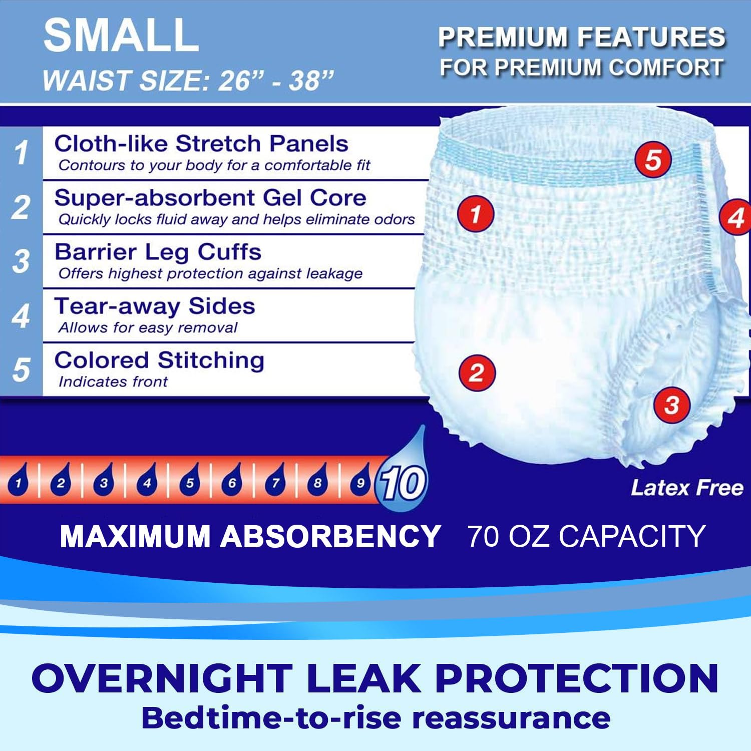 - ✔ OVERNIGHT INCONTINENCE PRODUCT - You can get your rest back. With age, and after surgery or post-pregnancy, many people experience loss of bladder control. Eliminate leaks with the added convenience of disposable adult underwear. Always ships discreetly.