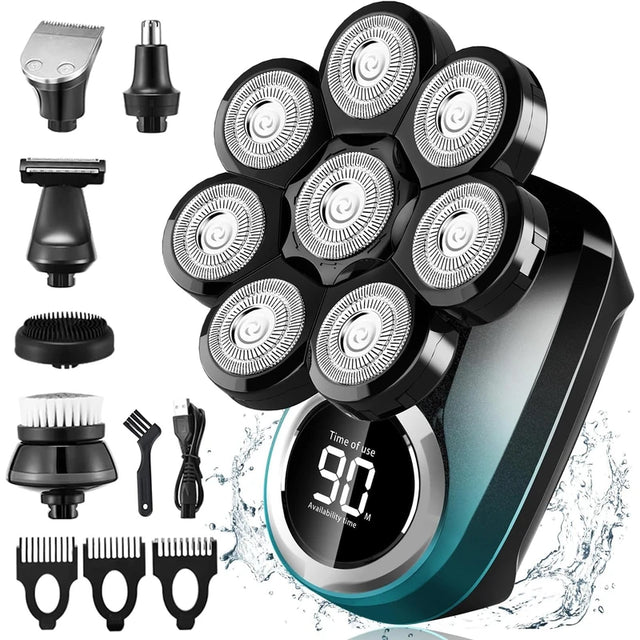 - 6-in-1 and practical trimmer sets: the men's electric razor contains 6 removable accessories: head/beard razor, nose/ear hair trimmer, hair trimmer (3/5/7 mm), face massage brush, facial cleansing brush, body trimmer. Professional 6-in-1 multifunctional skull shaver, various types of accessories for head shavers meet all your personal shaving needs for beard and hair