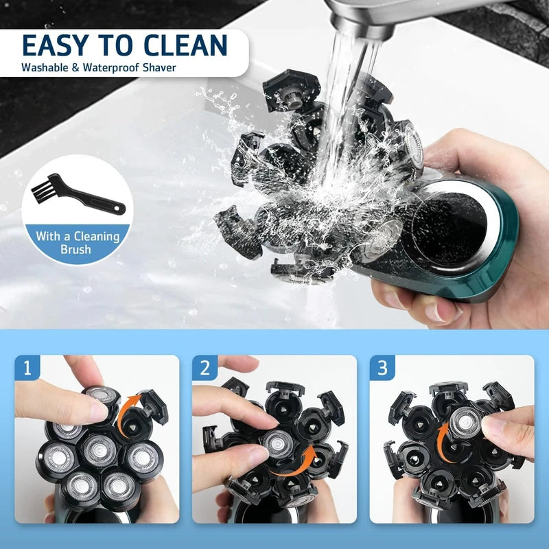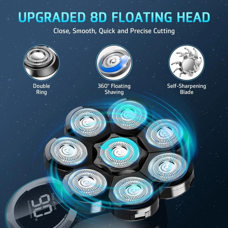 - Precision and flexibility: all heads of our beard trimmer have skin-friendly and durable blades. Our baldness razor with 8D floating heads and blades automatically adjusts to any angle of your face, neck and head, including the jaw bone to ensure close contact with the skin. This gives you an efficient, comfortable, smooth and thorough shaving experience