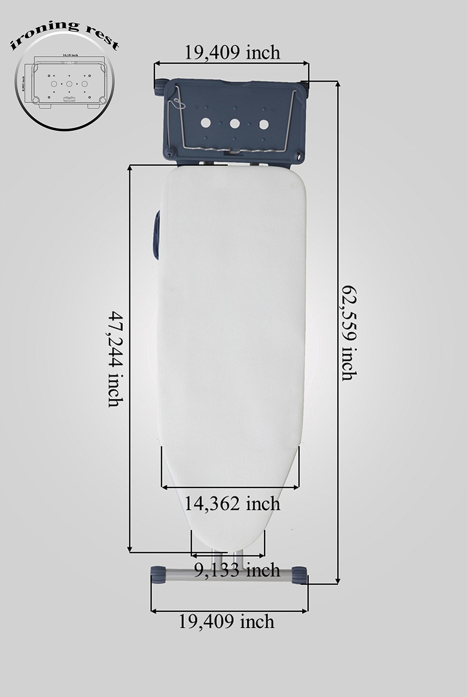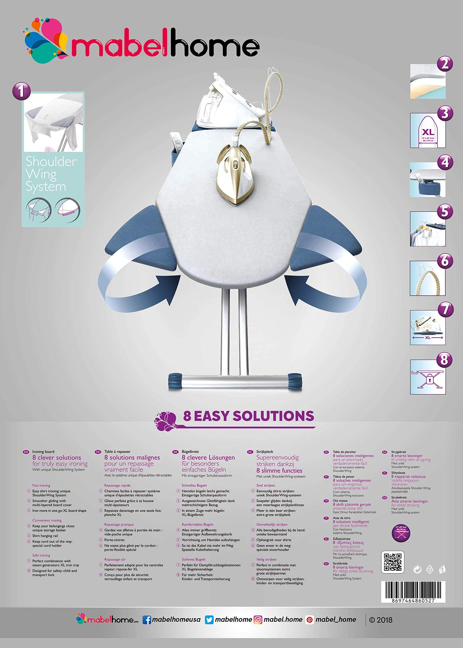 Details: 100% Natural cotton cover Mabel Home Ironing Board with 8 revolutionary new features! Fast Ironing: Smooth friction-free gliding on 100% natural cotton cover Retractable shoulder wing system: extra-large board Convenient Ironing: Storage basket; clothes hanging rail; cord holder Safe Ironing: large heat resistant iron tray; safety transport lock Adjustable Height: Adjustable to 6 different pre-set heights Minimum Height: 27.5" - Maximum Height: 36" Safety Lock: Prevents the board from accidently collapsing while in use Convenient Transport Lock: Keeps the board folded during storage and transport. Patented retractable wings: for easier ironing of shirt shoulders and pillowcases. Heavy duty and professional ironing board