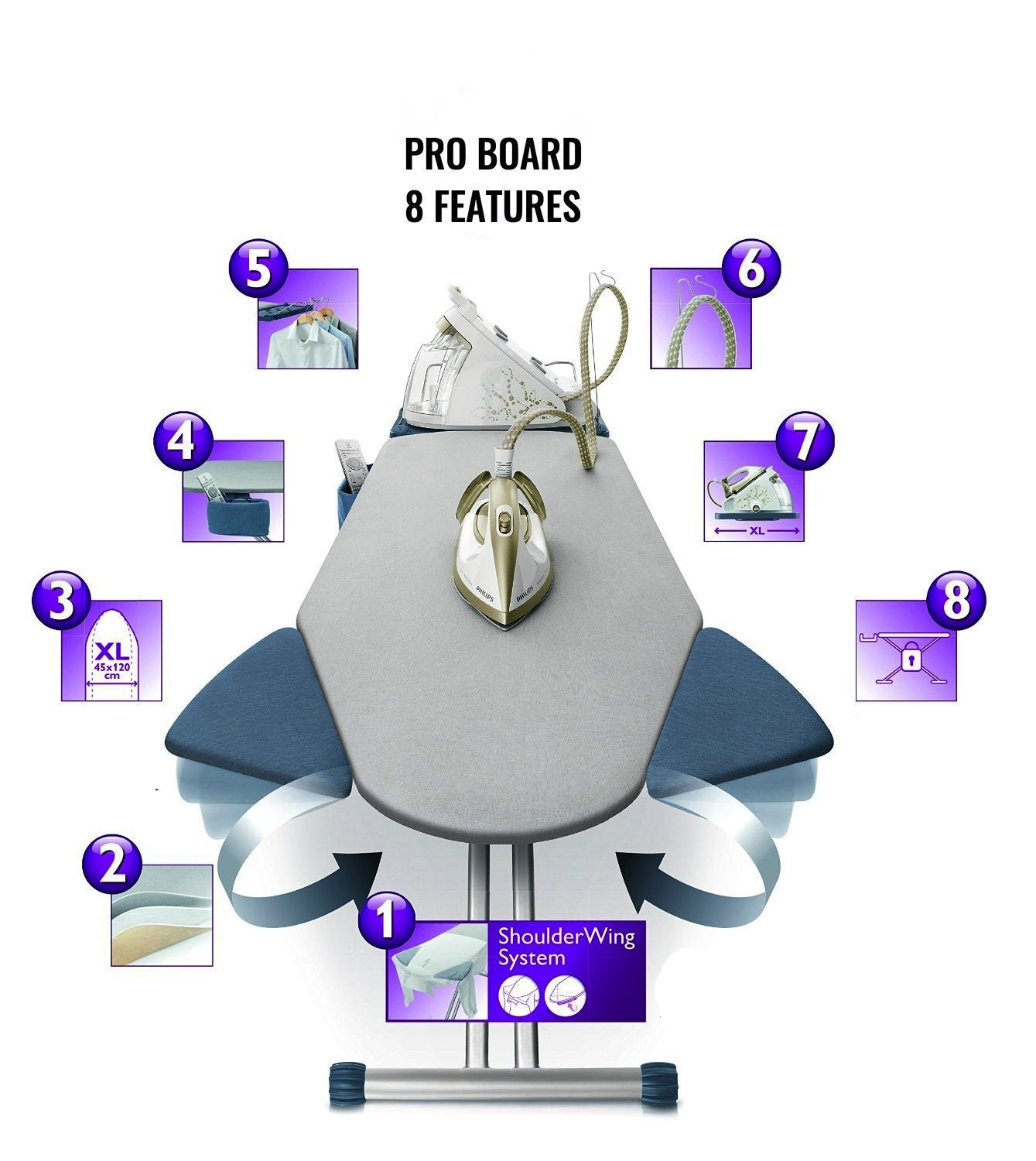 - Heavy-duty padded board cover with 100% cotton surface layer, + extra cover includedExtra-large board (wider ironing surface) with heat resistant outboard support tray to hold your Iron/SteamerOutboard tray features a handy cord holder.