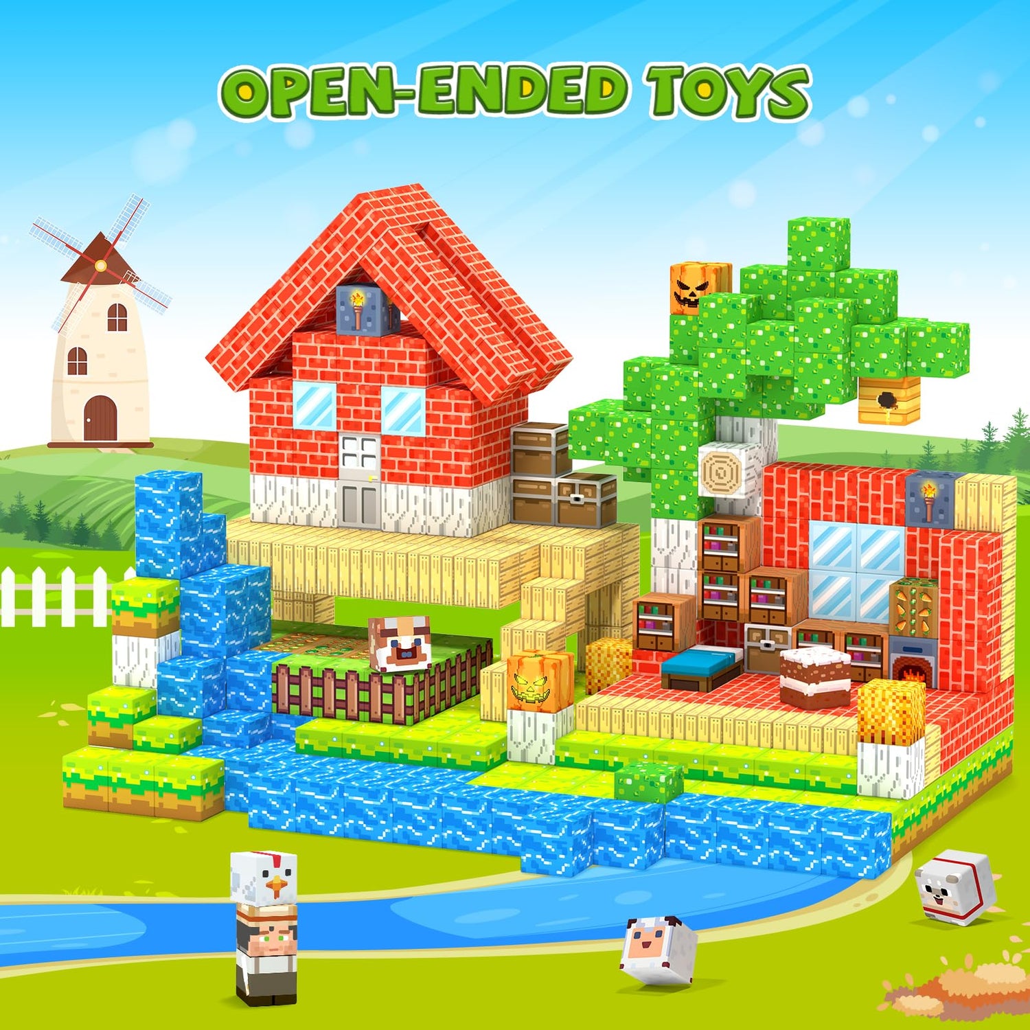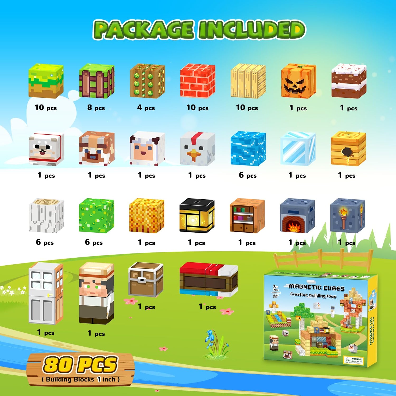 - Magnetic Blocks Set–The 80-piece (1x1x1IN) magnetic building blocks set features dual play zones: working farm outdoors and cozy living house indoors. It contains 28 lively pattern designs, The kid-friendly designed manual makes building effortless - Kids 3+ can proudly build independently, developing STEM skills while playing their dream farm games, boosting confidence, concentration and creative thinking!