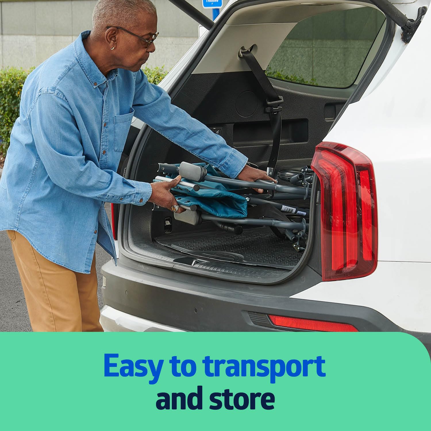 - FOLDS EASILY FOR TRANSPORT: Compact design folds easily, including backrest that folds down and detachable footrests for convenient storage and transport in car trunk; no assembly required