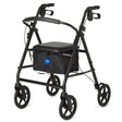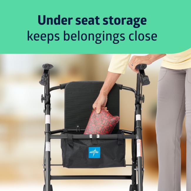 Trusted by healthcare workers and hospitals everywhere, Medline’s aluminum rollator walker for adult transport is the perfect support for the elderly and those who have mobility impairments. Equipped with four, 8" wheels, it easily moves you from indoors to outdoors and over uneven terrain, smoother than ever before. This foldable Medline aluminum rollator walker for adult transport and mobility impairment features a 12 x 12" black padded seat and backrest to ensure maximum comfort. Weighing 14 pounds, this compact black aluminum walker impressively supports up to 300 pounds. This walker is great for seniors and those with limited movement ability. Transporting you and your essentials safely has never been so convenient with our spacious under bag storage. The walker locking mechanism is simple enough for anyone to use and activates when utilizing the hand brakes. Squeeze the easy grip handles and the locker will immediately lock into place, stopping the walker from rolling in any direction. This is a great walker for seniors and adults seeking more stability. Effortlessly customize your walker by flipping up the backrest for more room, or adjust the height of the handles to your perfect fit.