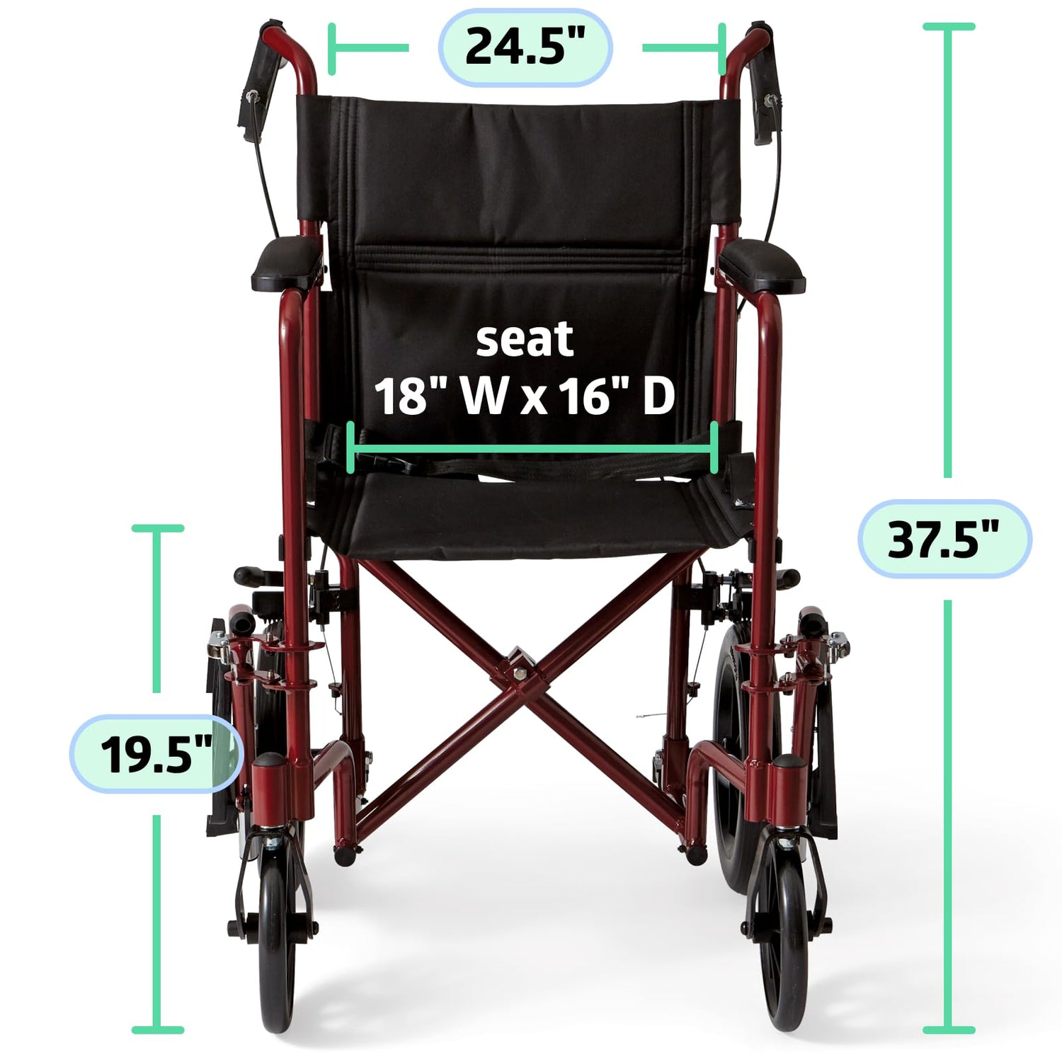 Details: Medline lightweight transport wheelchair with easy-to- use hand brakes allows you to travel safely and easily no matter where your day takes you. It’s the perfect choice for indoor/outdoor use, with larger 12” rear wheels for maneuvering through obstacles; 19” wide seat, comfortable hand grips and a seat belt for safety. Weighs 26 lbs. and features a compact, easy-fold design that fits in most car trunks or the back seat. Dimensions: 30.25”L x 19”W x 37.25”H (assembled); 30.25”L x 12”W x 37.5”H (folded). Features easy-to-clean black, nylon upholstery. No assembly required.