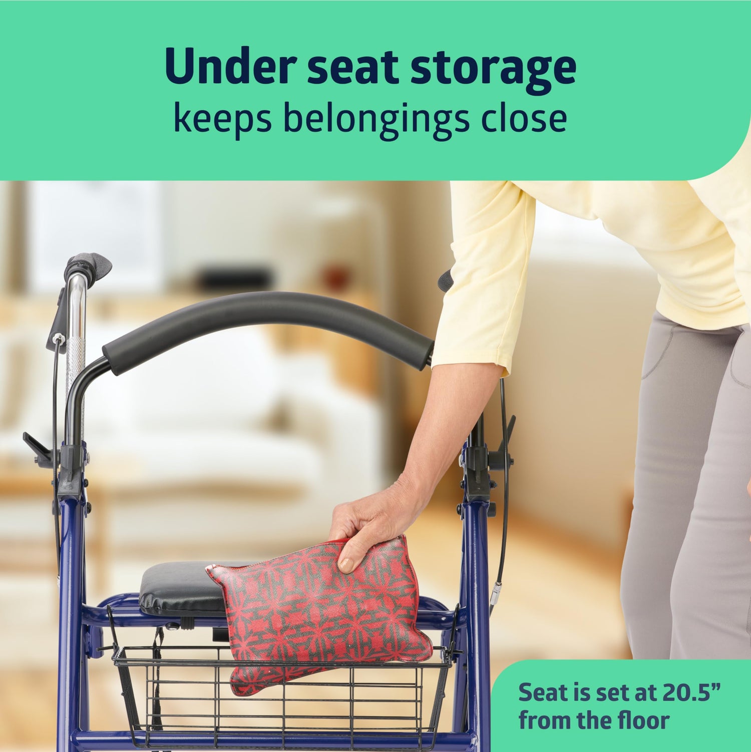 Details: Trusted by healthcare workers and hospitals everywhere, Medline’s steel rollator walker with padded seat and backrest is the perfect support for seniors, adults and elderly, and those who have mobility impairments. Available at a great value, this rollator is equipped with 8" wheels to easily move from indoors to outdoors smoother than ever before. Features 12x12" black padded seat, weighs 17 lbs., supports up to 300 lbs, and comes in a blue steel frame. This walker is great for adults and seniors and those with limited movement ability. Fit with easy-to-remove wire basket for convenient storage. To engage brakes, simply squeeze the easy-grip handles. To keep wheels in a safe, locked position, push grip handles to the down position. This prevents the rollator from moving when standing still, sitting down or standing up. Effortlessly customize your walker by flipping up the backrest for more room, or adjust the height of the handles to your perfect fit.