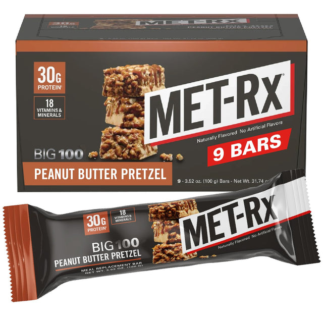 - One 9 count box of MET-Rx Big 100 Protein Bars, Peanut Butter Pretzel