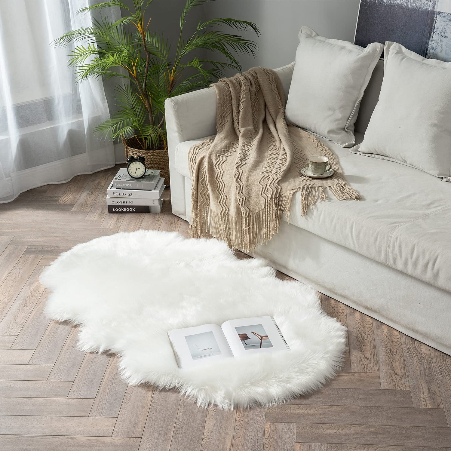 - 【Size & Color】Package includes one 3ft x 5ft irregular sheepskin-like area rug. It comes in a white color, resembles genuine fur very much, super shaggy and comfortable. Please allow 0.5~1inch deviation because of manual cutting and measurement. Color may be different in different light or on different screen.
