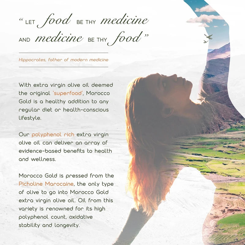- The olives used for Morocco Gold are carefully harvested and cold-pressed early in the season when they are young, ensuring a fresh and flavorful oil. There is no mixing or blending with other oils throughout the season to preserve its original taste.