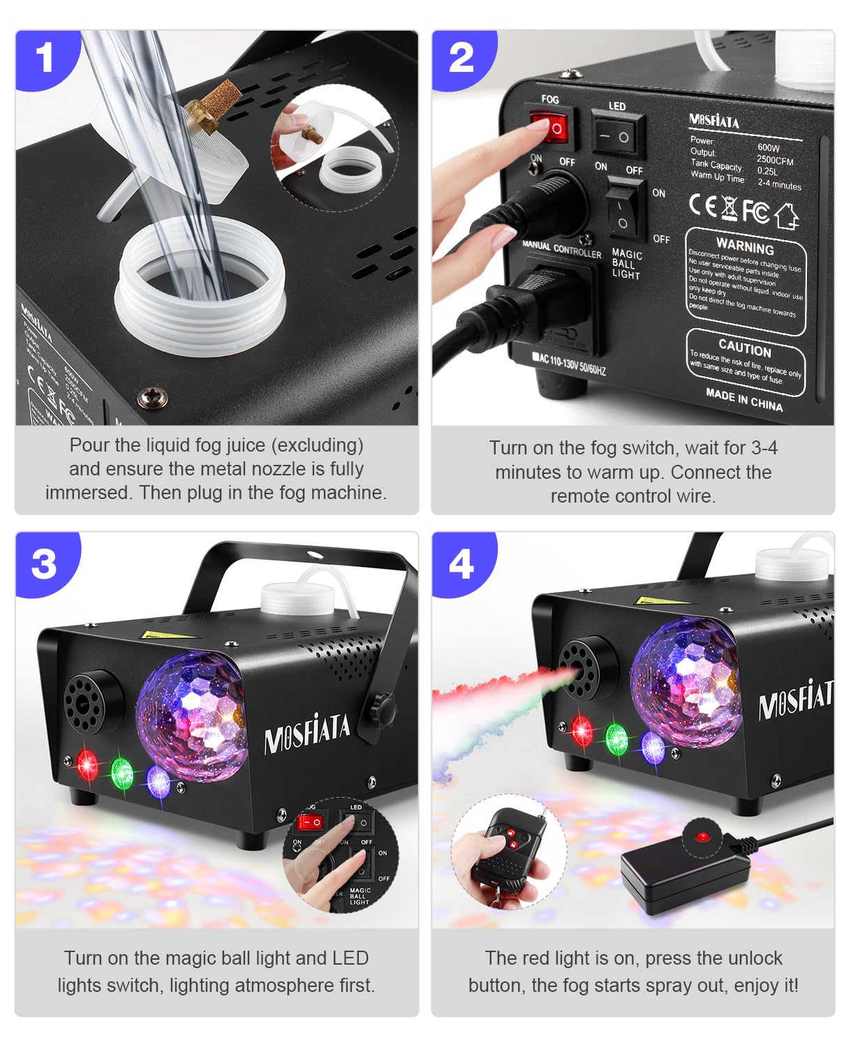 MOSFiATA Fog Machine with Disco Light 600W Smoke Machine RGB LED lights, 2300 CFM Spray, Remote Control, Perfect for Halloween, Christmas, Wedding, Party, Club, DJ Stage Effect