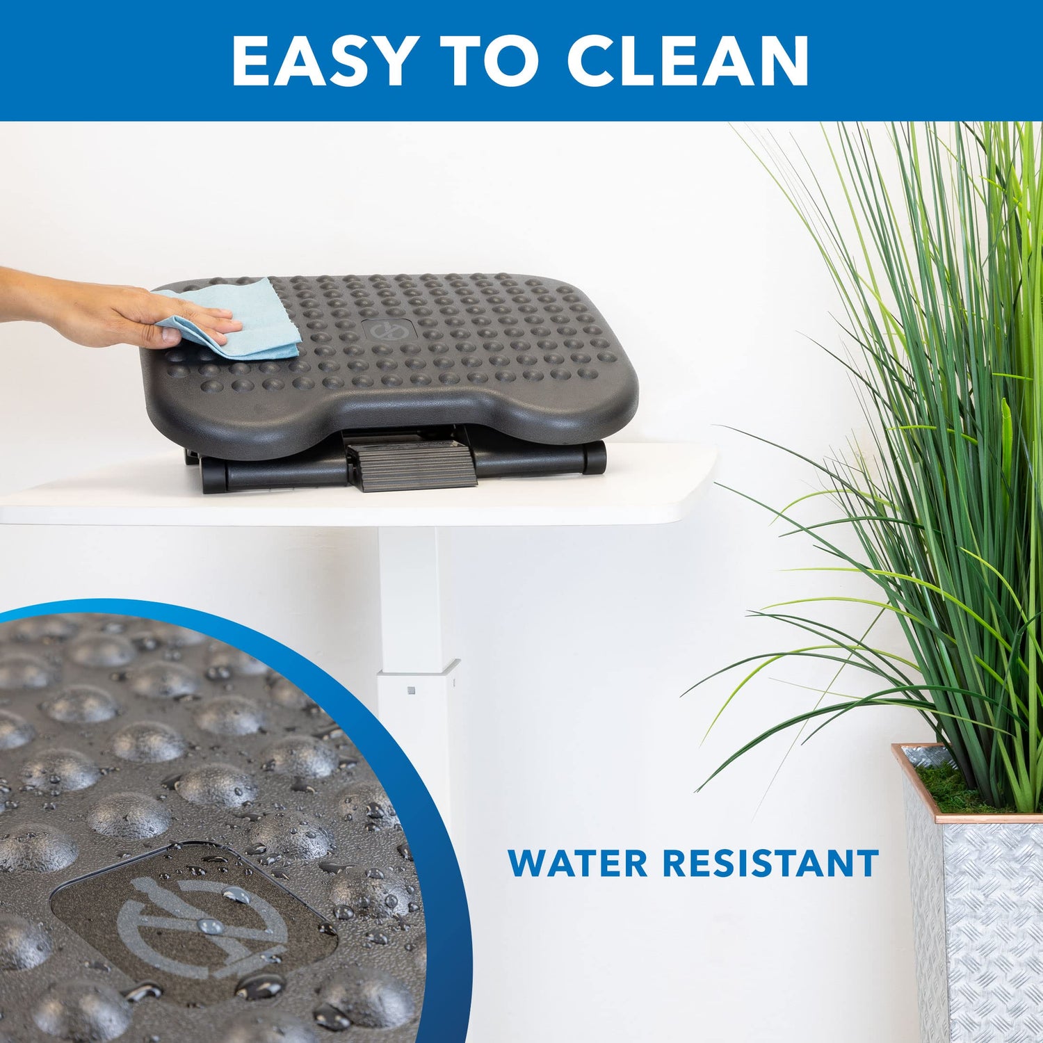 - ERGONOMIC OFFICE FOOT REST - Increase comfort at your desk. Keep legs and feet elevated for less strain and fatigue. Adjustable height and angle reduces pressure on lower back and alleviate discomfort while sitting.
