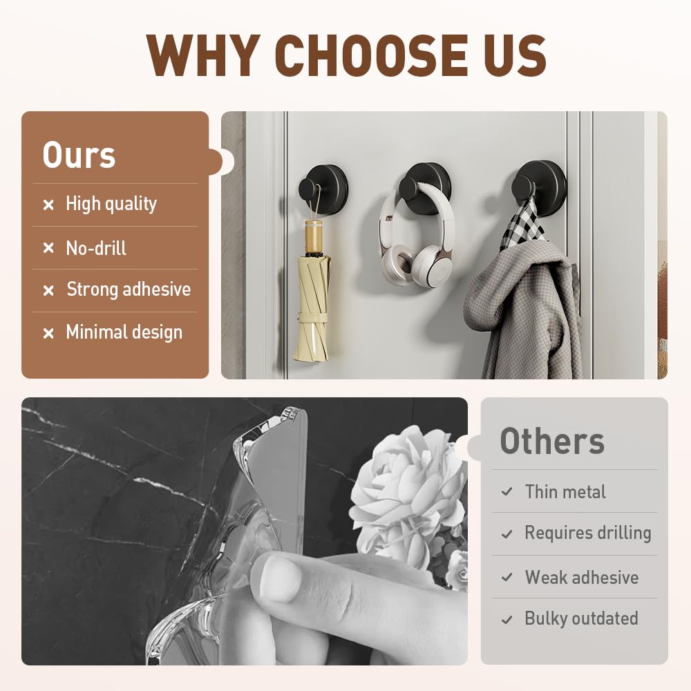 - 【Modern & Practical Design】Our suction cup hooks for hanging are compact, waterproof, and stylish, blending with any décor. Whether you need suction cup hooks for shower use, front door wreaths, or extra door hooks for hanging towels, these hooks do it all