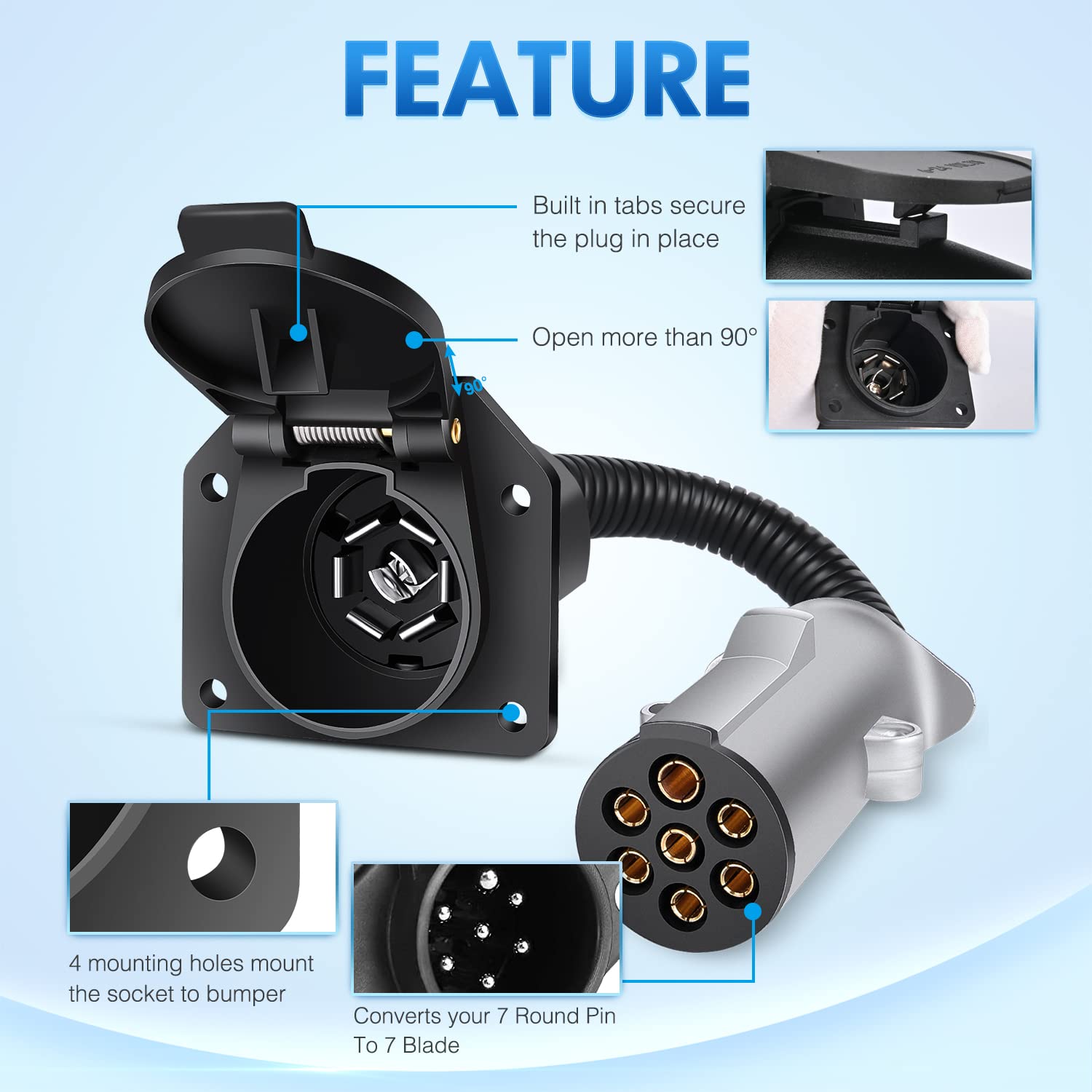 - 7 Way Round to 7 Way Blade Adapter: This 7 Pin Round to 7 RV Blade Adapter designed to transfer your vehicle-side 7-Pin Round Socket to a standard 7-Way Blade Plug to be able for towing trailer with 7-way RV-style. 7 Way Round Pin is common found in Semi Truck / Commercial Vehicle / Pickup Truck / Tractor.