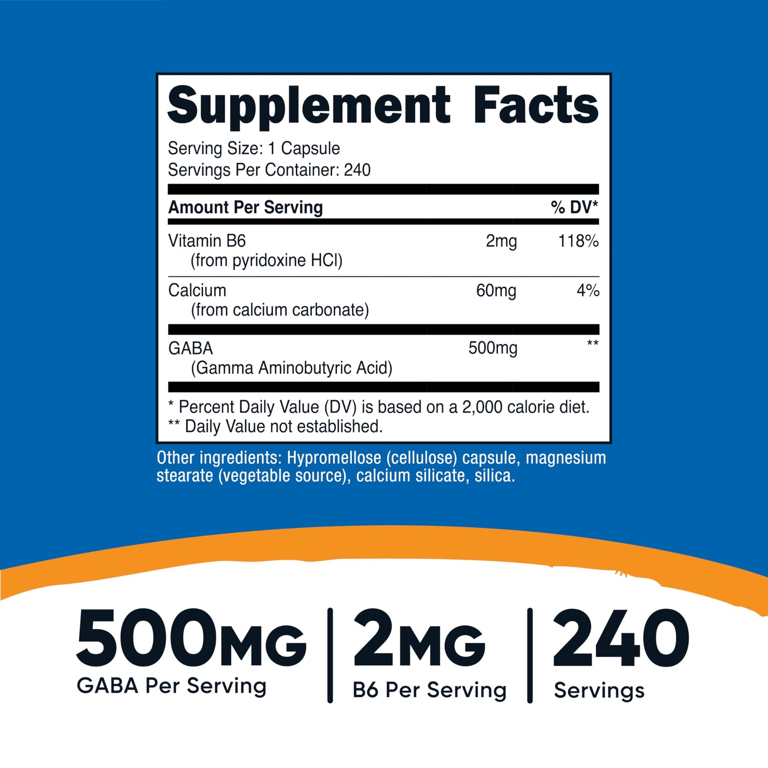 Details: 500mg of GABA & 2mg of Vitamin B6 in Every Capsule 240 Plant-Based "Veggie" Capsules 8 month supply (if taken as recommended) Vegetarian, Non-GMO, Gluten Free Made in a GMP Compliant, FDA Registered Facility 500mg of GABA & 2mg of Vitamin B6 in Every Capsule 240 Plant-Based "Veggie" Capsules 8 month supply (if taken as recommended) Vegetarian, Non-GMO, Gluten Free Made in a GMP Compliant, FDA Registered Facility
