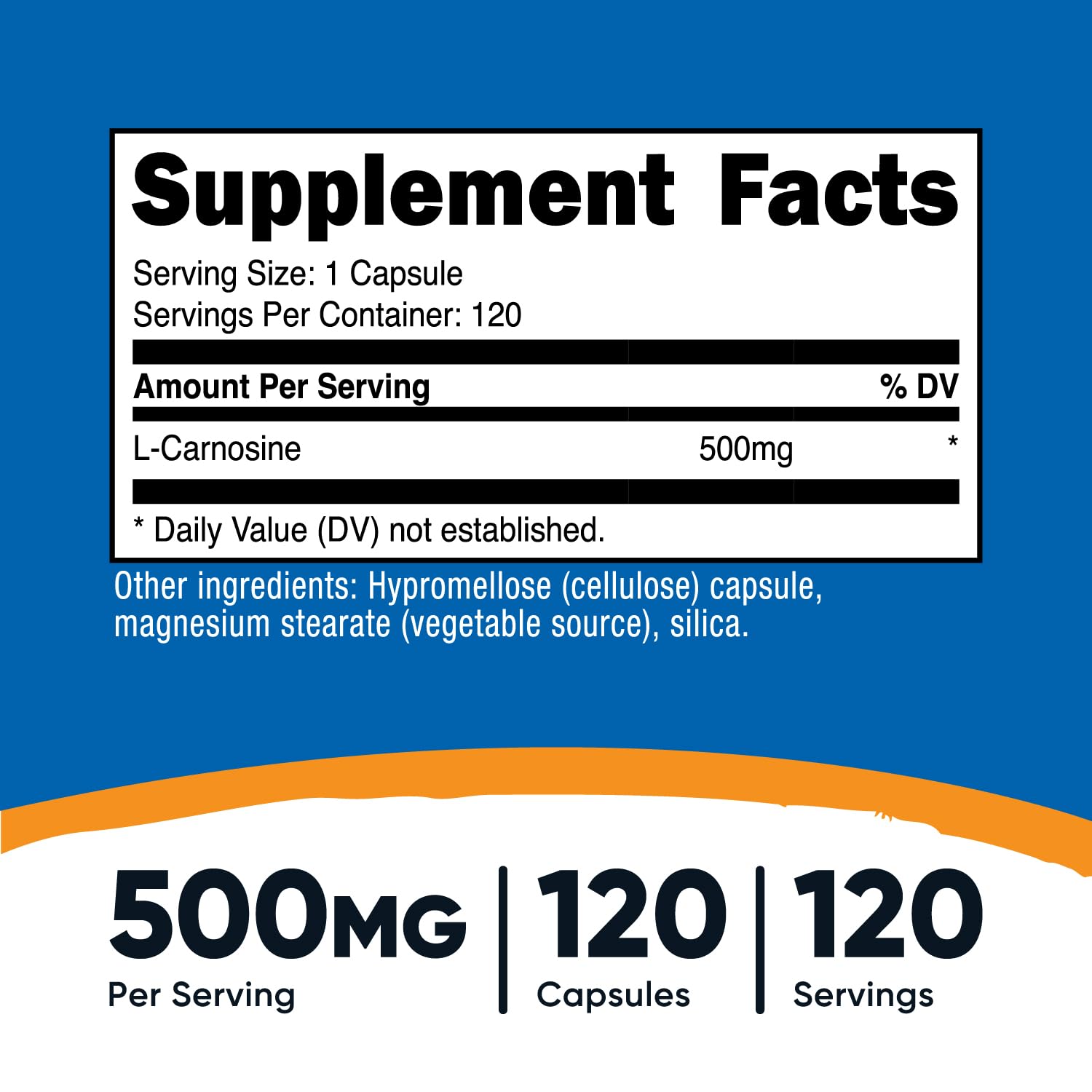 Details: L-Carnosine is a protein building block concentrated in muscle and the brain. Nutricost's L-Carnosine contains 120 capsules and servings per bottle. There are 500mg of l-carnosine per serving. This supplement is non-GMO and gluten free.