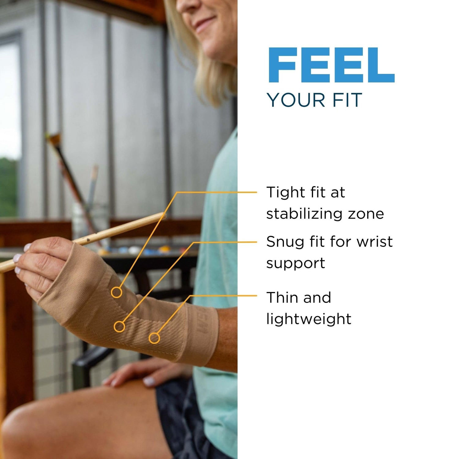 - RECENTLY REDESIGNED: You spoke, and we listened. The WS6 wrist sleeve has been redesigned with a wider palm and thumb area reducing the friction between the thumb and first finger. WS6: easy-on fit is designed with a separate thumb area for proper placement & can be worn on either hand & still provide guaranteed support. For best fit, measure the circumference of the wrist then refer to the sizing chart to order.