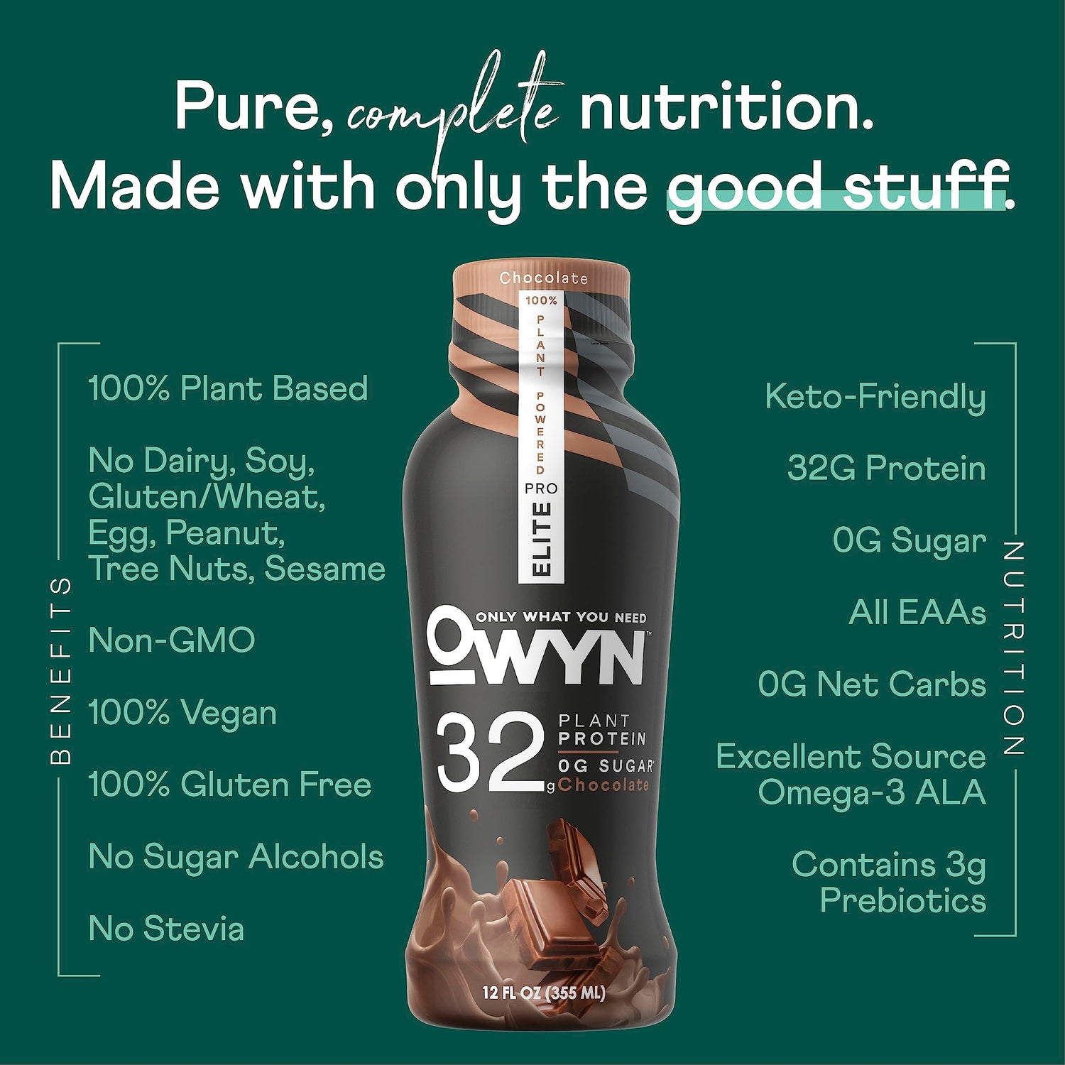 OWYN Only What You Need Pro Elite Vegan High Protein Keto Shake, 32g Protein, 9 Amino Acids, Omega-3, Prebiotics, Workout and Recovery, 0g Net Carbs, Zero Sugar (Chocolate, 12 Fl Oz (Pack of 24)