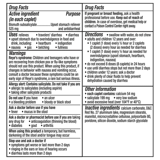 - CONVENIENT FORM: Pepto Bismol Caplets are a convenient way to get on-the-go relief from your upset stomach symptoms