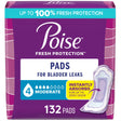 - POISE INCONTINENCE PADS: 132 incontinence and postpartum bladder leak pads, 4 Drop Moderate Absorbency, regular length (132 pads total)