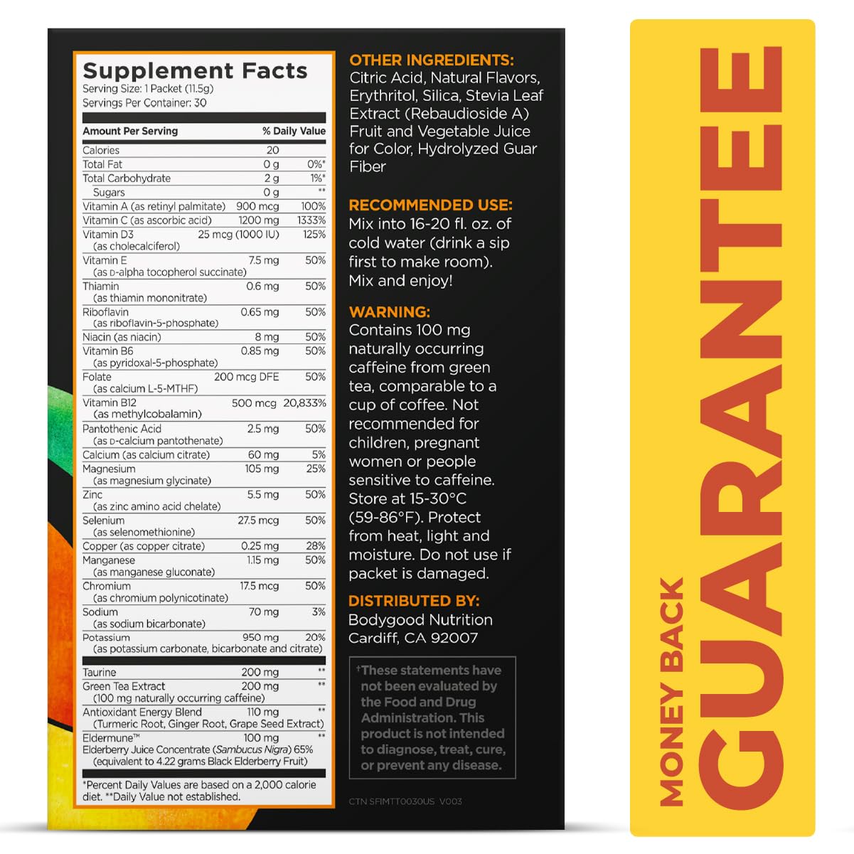 - BOOST YOUR ENERGY + IMMUNE SYSTEM: 100 mg of natural green tea caffeine combined with B12 for a sustained, powerful energy boost.* Packed with 28 vitamins, minerals and herbs like 1,200mg of Vitamin C, Elderberry, Vitamin A & D, Selenium and Zinc. Contains electrolytes for rapid hydration.