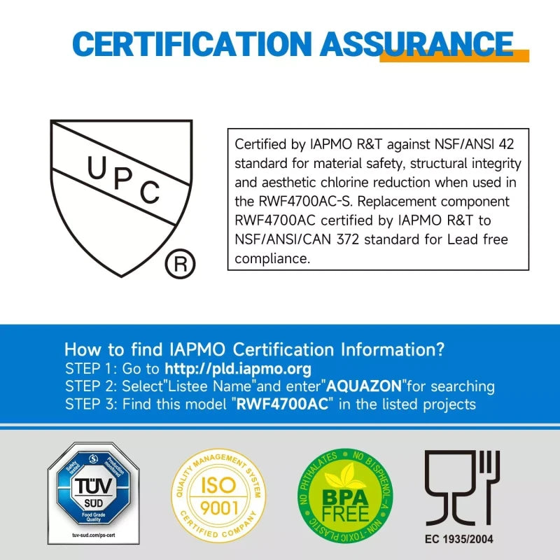 - NSF/ANSI 42 certification information: Certificate File No. C0552639, 2021. Certificate No. WP-12918, by IAMPO, 2021.