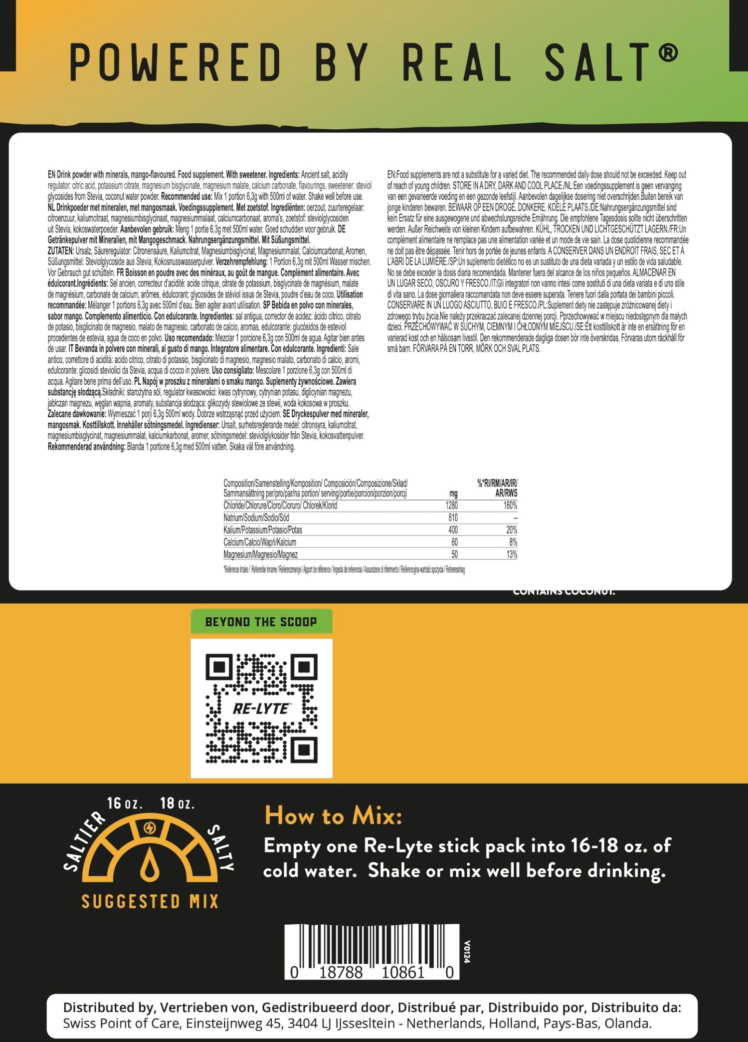 - WHAT'S IN RE-LYTE? - Sodium 810mg Potassium 400mg Choride 1280mg Calcium 60mg Magnesium 50mg Coconut Water Powder 80mg