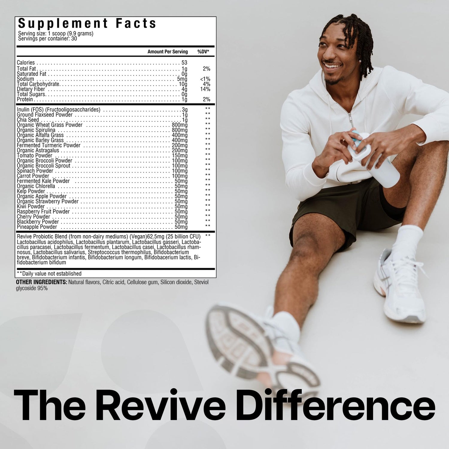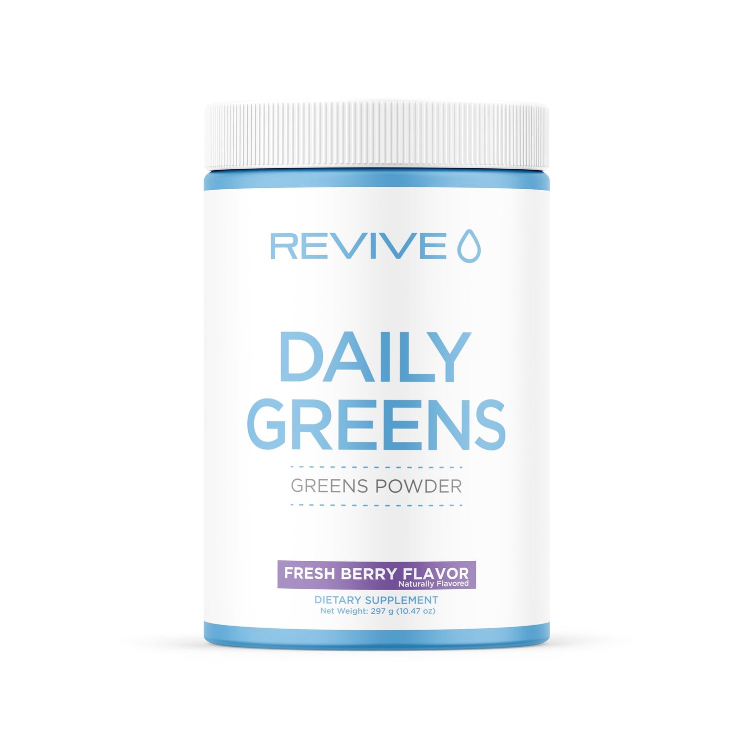- Absorb Essential Nutrients: Daily Greens from Revive provides your body with a powerful dose of nutrient-dense greens and has been formulated for those with diets low in fruits and vegetables. If your daily intake of fruits and vegetables is lower than the recommended amount, this supplement is for you. Flavor: Fresh Berry. 10.47 oz, 30 servings.