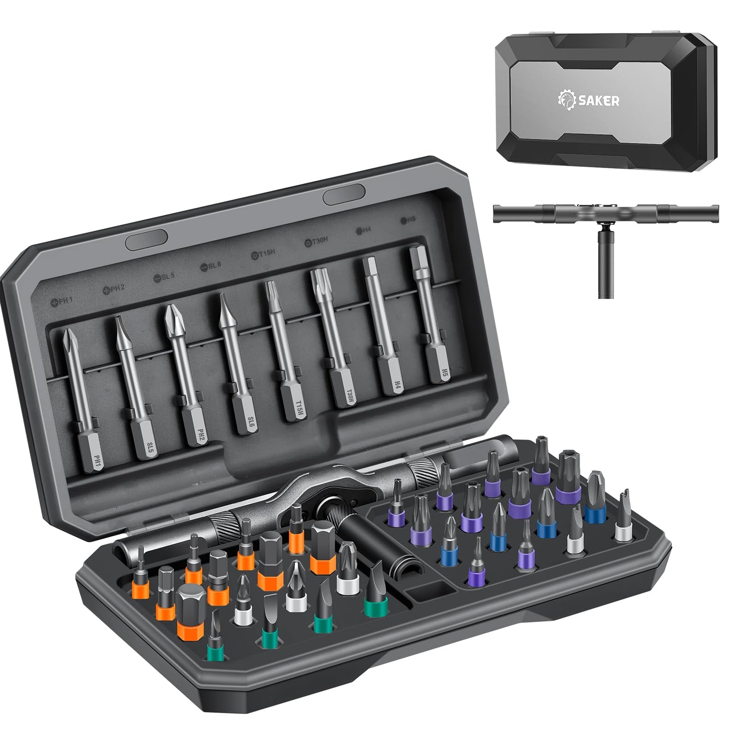 - 【T Handle Ratchet Screwdriver】Saker 42 in 1 screwdriver set includes a ratchet screwdriver with an ergonomic ratchet design that allows for easy switching between forward, backward, and locking modes. It can easily tighten or loosen screws, saving you time and effort. If necessary, you can also stack screwdriver heads to obtain longer screwdrivers.