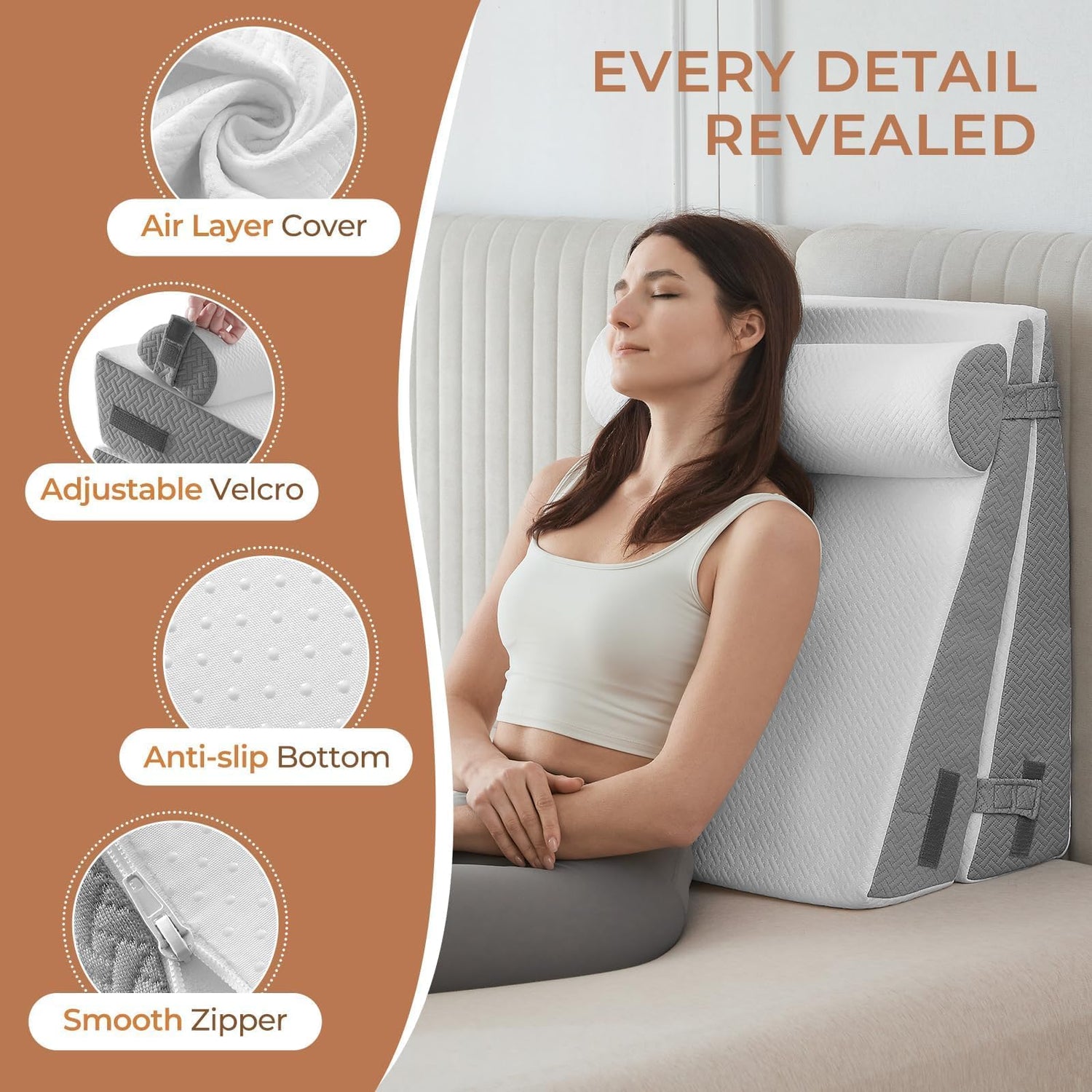 - Thoughtful Details: The breathable air-layer cover of our wedge pillow is removable for easy washing. Adjustable velcro straps allow you to adjust the pillow's height and position, while non-slip particles on the bottom ensure stability during use