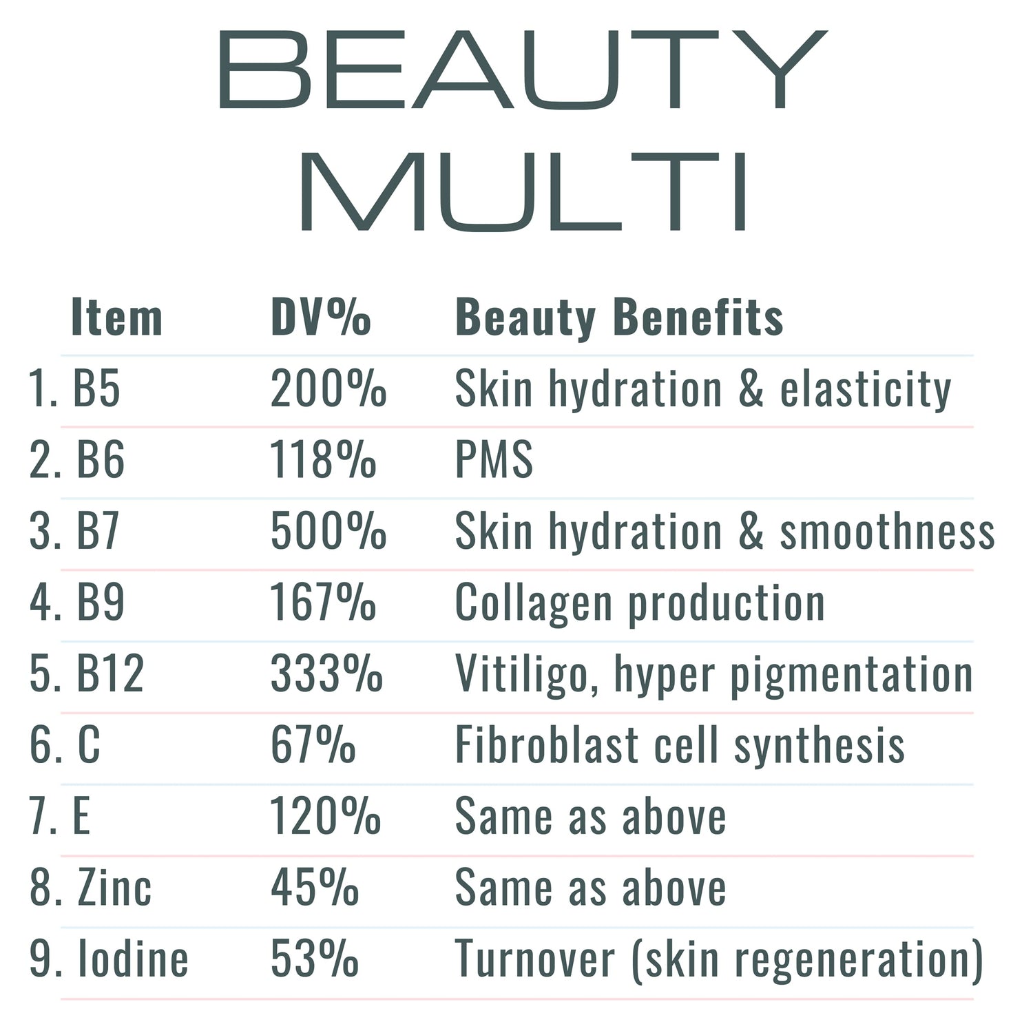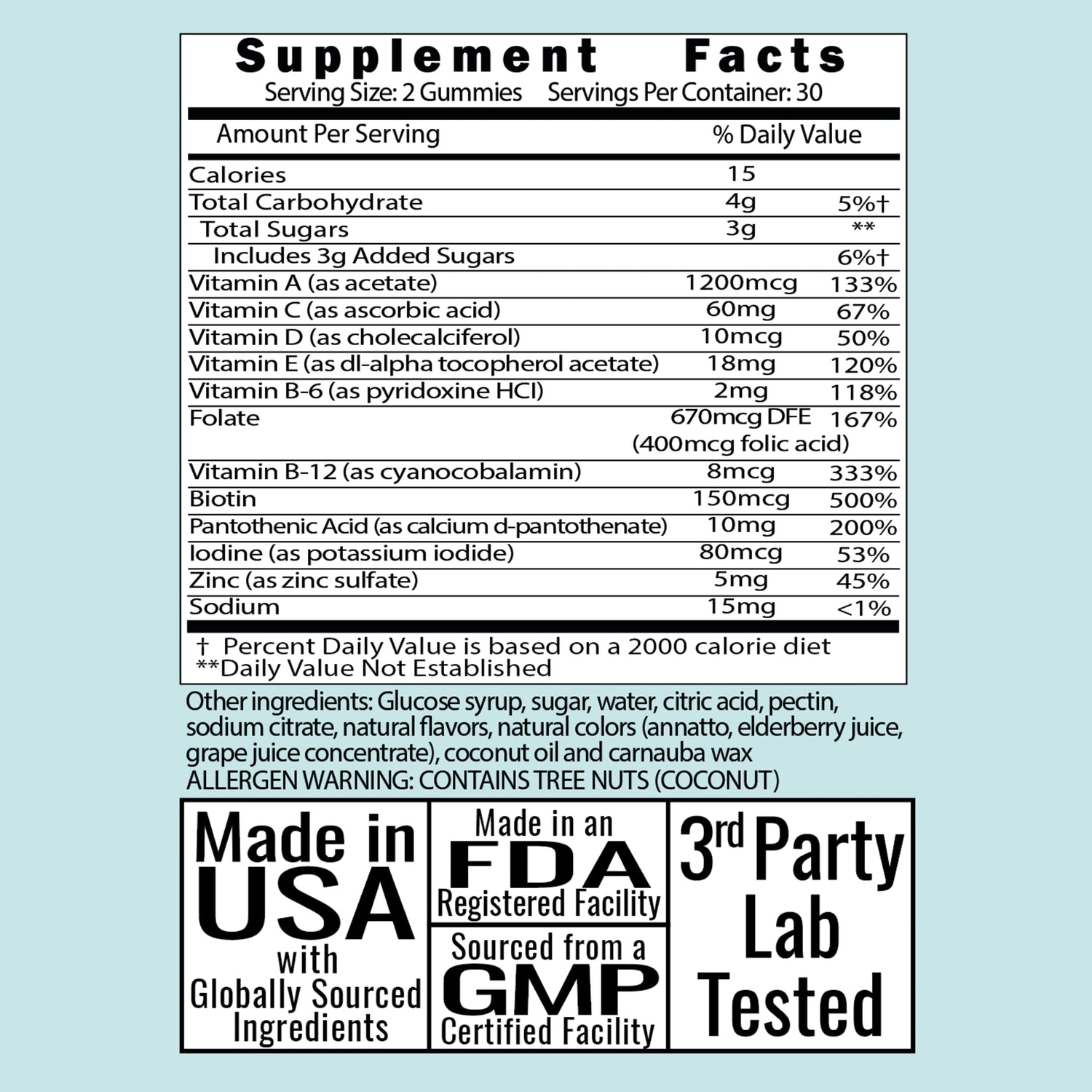 - Our gummies are supplemented with 1200mcg (DV 133%) of Vitamin A per serving. Our gummies are also supplemented with other multi-vitamins that can help maintain healthy - that is, hydrated, radiant, firm & elastic - skin. DVs are: Vitamin B5: 200%, B6: 118%, B7 (Biotin): 500%, B9 (Folate, Folic Acid): 167%, B12: 333%, C: 67%, E: 120%, Zinc: 45%, Iodine: 53%
